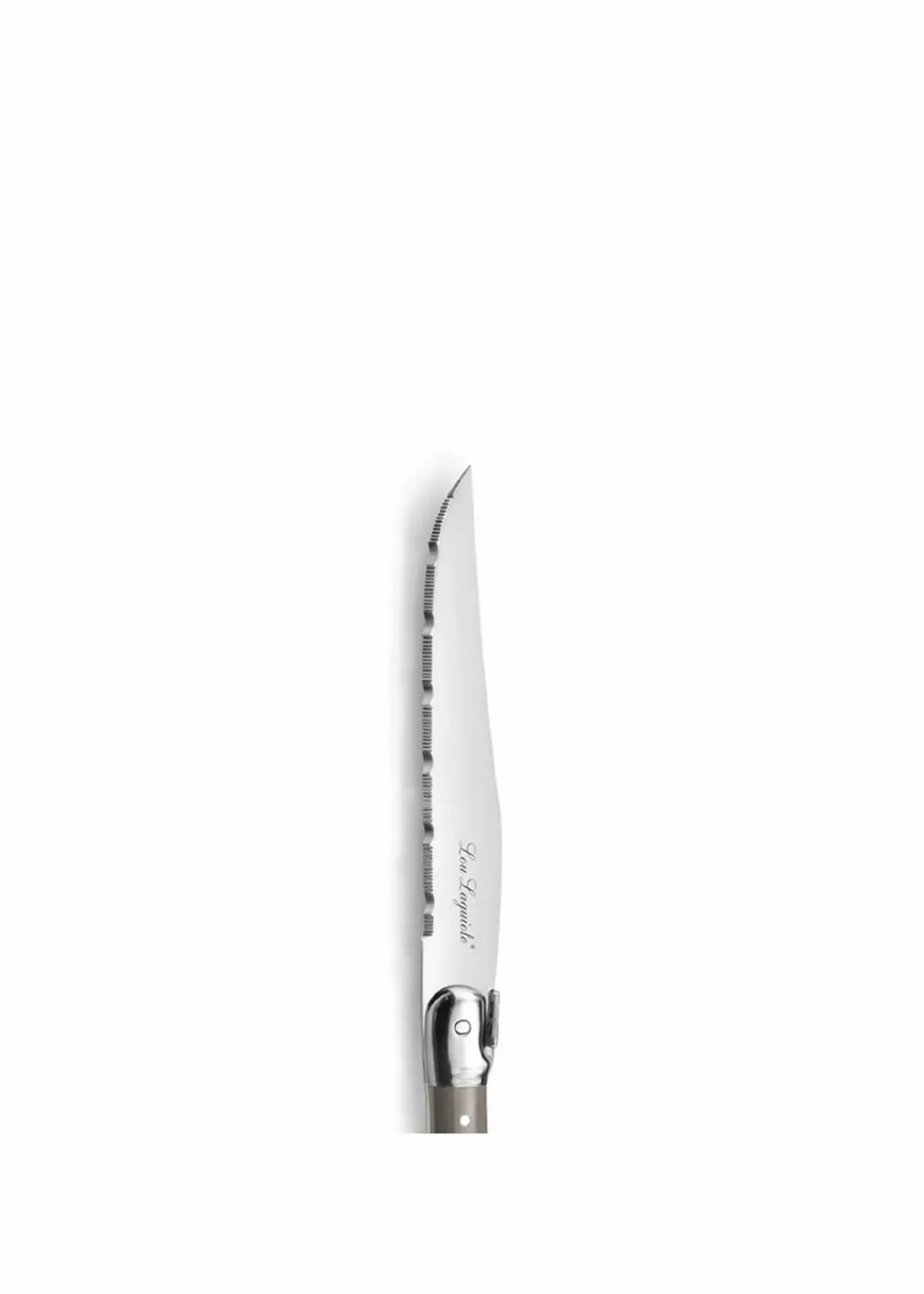 Rustikales Tafelbesteck mit französischem Charme. Formschöne, farbige Griffe mit traditionellen Nieten und Edelstahlkronen. Für authentisch-traditionelles Landhaus-Feeling. Qualität made in France. Besonders scharfe, mikroverzahnte Messerklinge. Bestehend aus 6 Kaffeelöffel, 6 Menügabeln, 6 Menülöffel, 6 Menümesser.