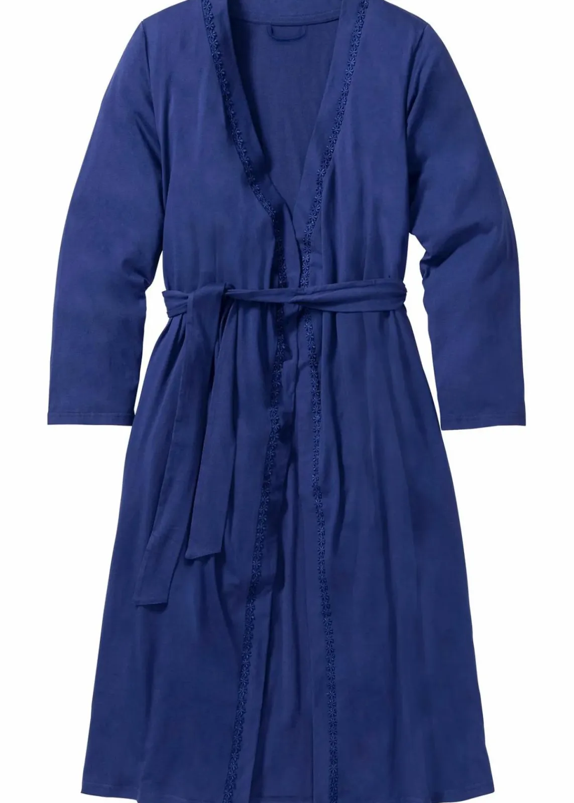 Der bequeme Jersey-Morgenmantel der Marke bpc lässt sich angenehm beim Saunen oder als Loungewear über dem Pyjama tragen. Das softe Material aus Baumwolle fühlt sich wunderbar auf der Haut an. Entlang des Schalkragens bis hinunter zum Saum ist der Bademantel mit einer Zierkante aus Blüten besetzt.Mit dem Bindeband lässt sich das Modell fixieren. Die zwei Eingrifftaschen an den Seiten machen das komfortable Design komplett.