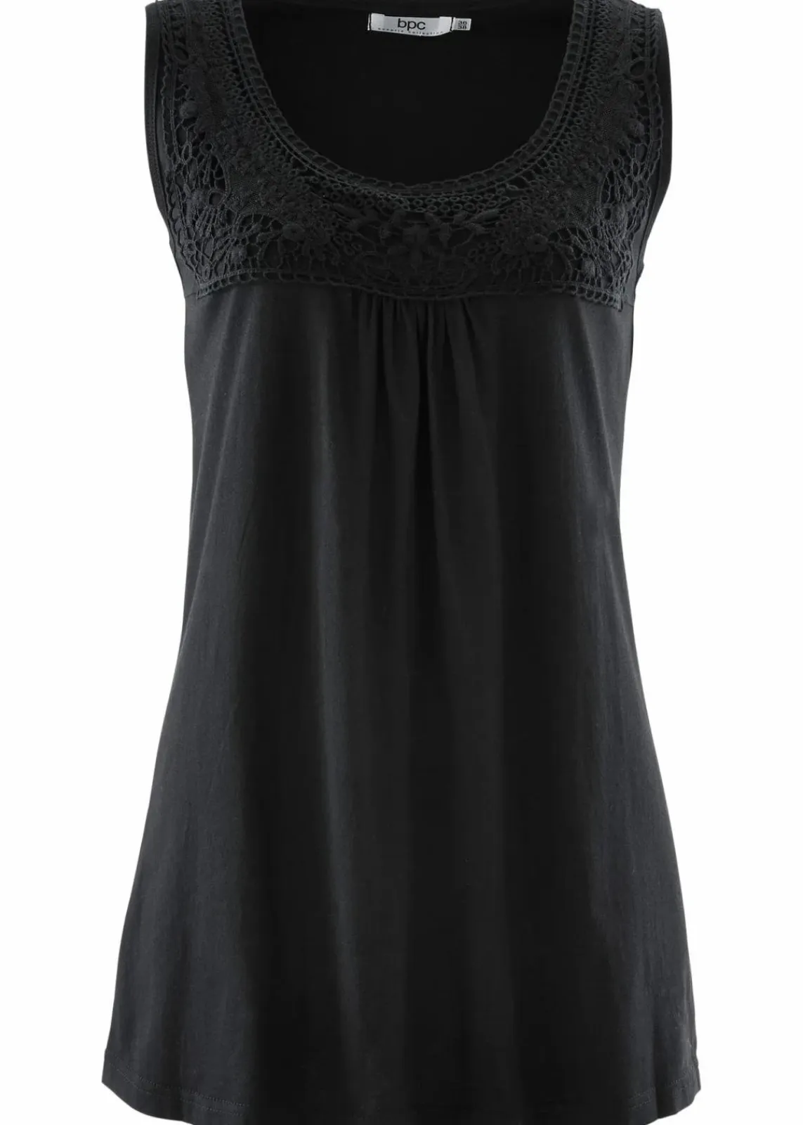 Ein Ton in Ton gehaltener Besatz aus Spitze schmückt das luftige Top von der Schulter bis zur Büste und schafft einen besonderen Rahmen für das Dekolleté.Mit einer dezenten Raffung unterhalb der Büste und seiner leicht ausgestellten Saumweite schmeichelt das Top von bpc der weiblichen Figur. Das leichte Material bietet auch an warmen Tagen ein angenehmes Tragegefühl.
