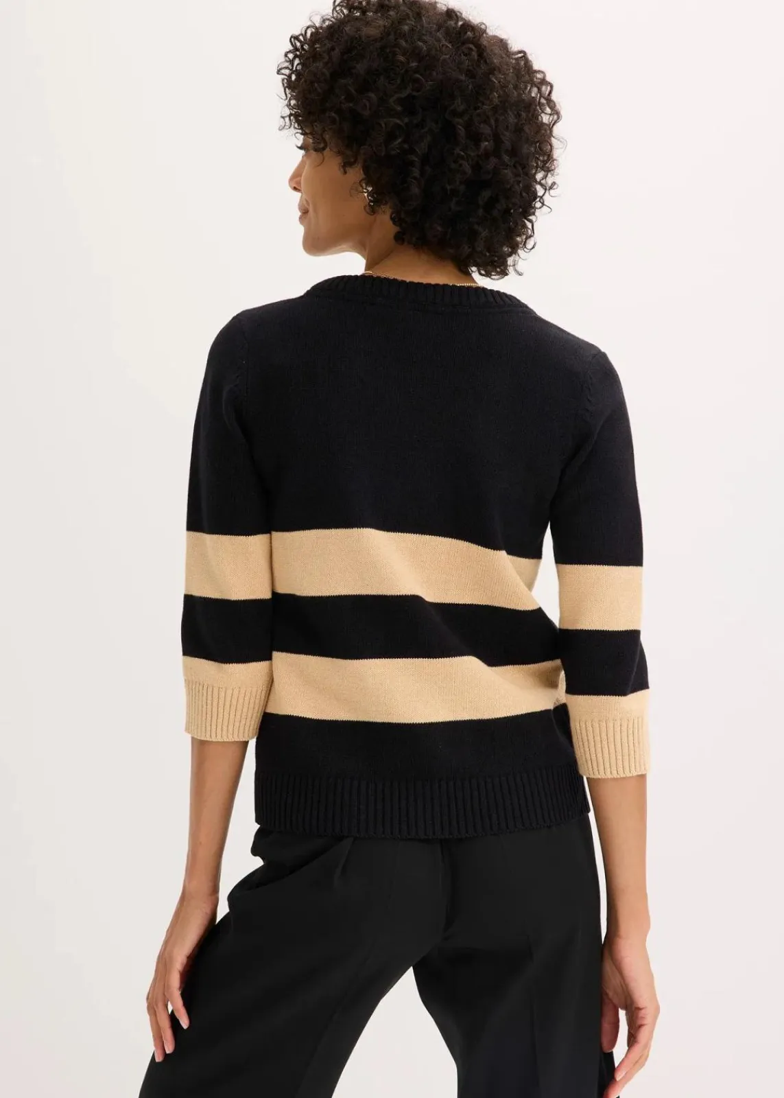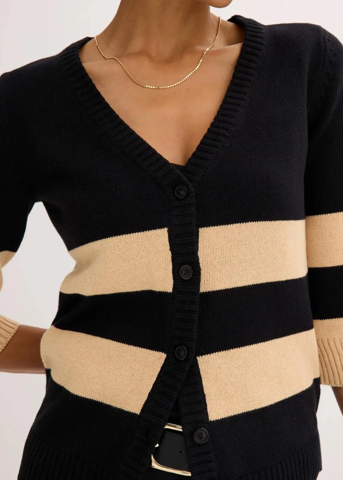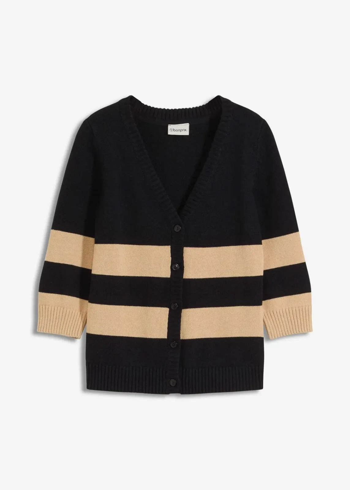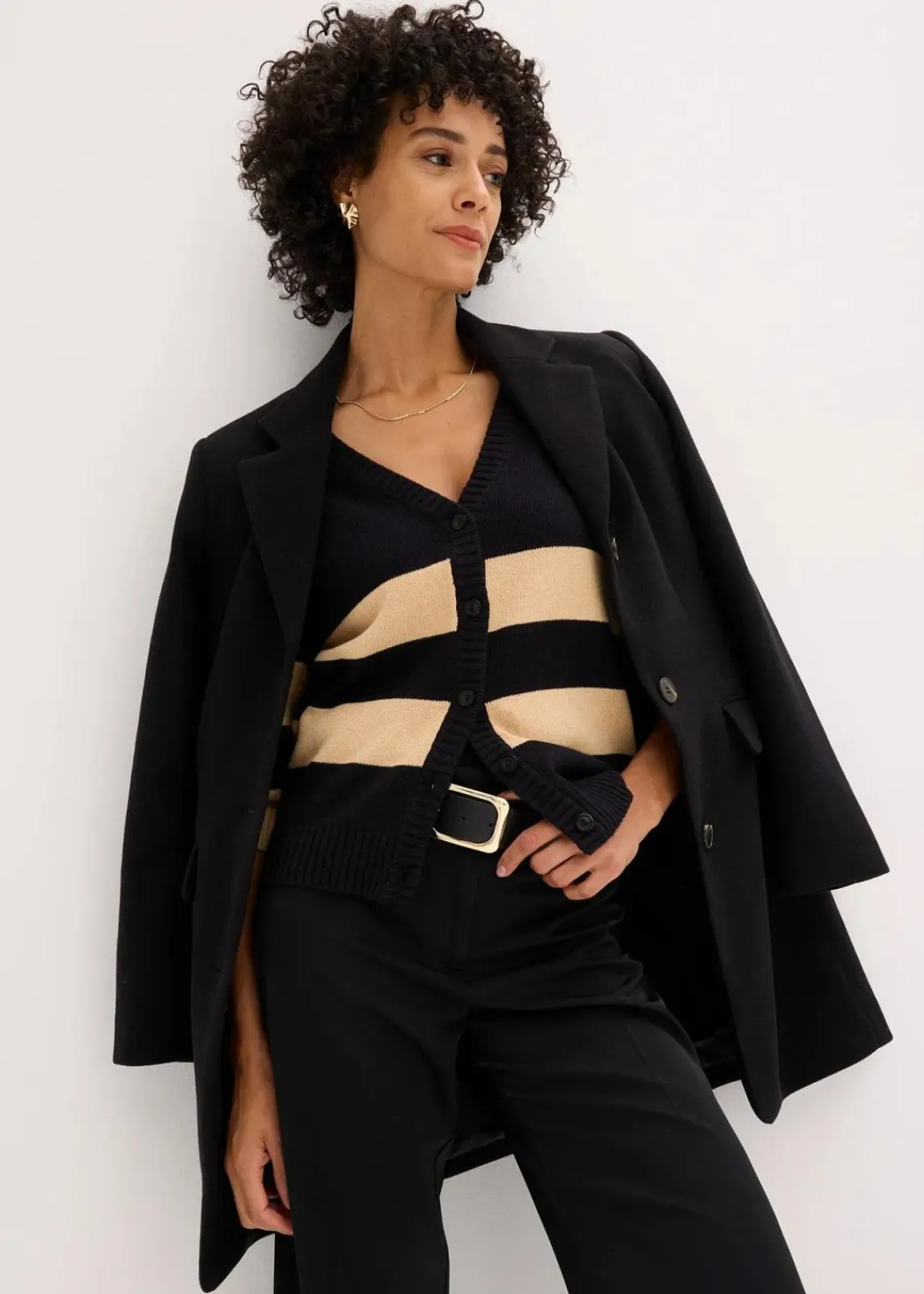 Diese schöne Strickjacke fällt durch ihre Streifen modisch auf. In Kombination mit einer edlen Jeans von bpc selection und einem schlichten Shirt sowie feminine Schuhe entsteht ein stilvolles Outfit.