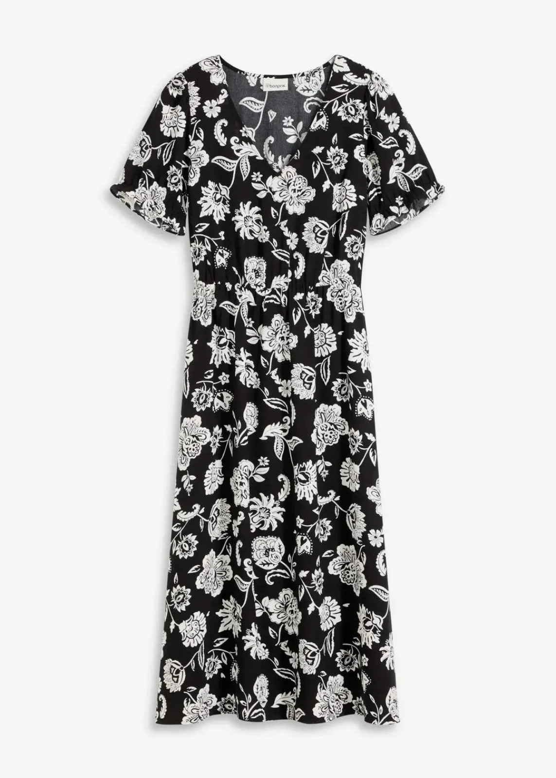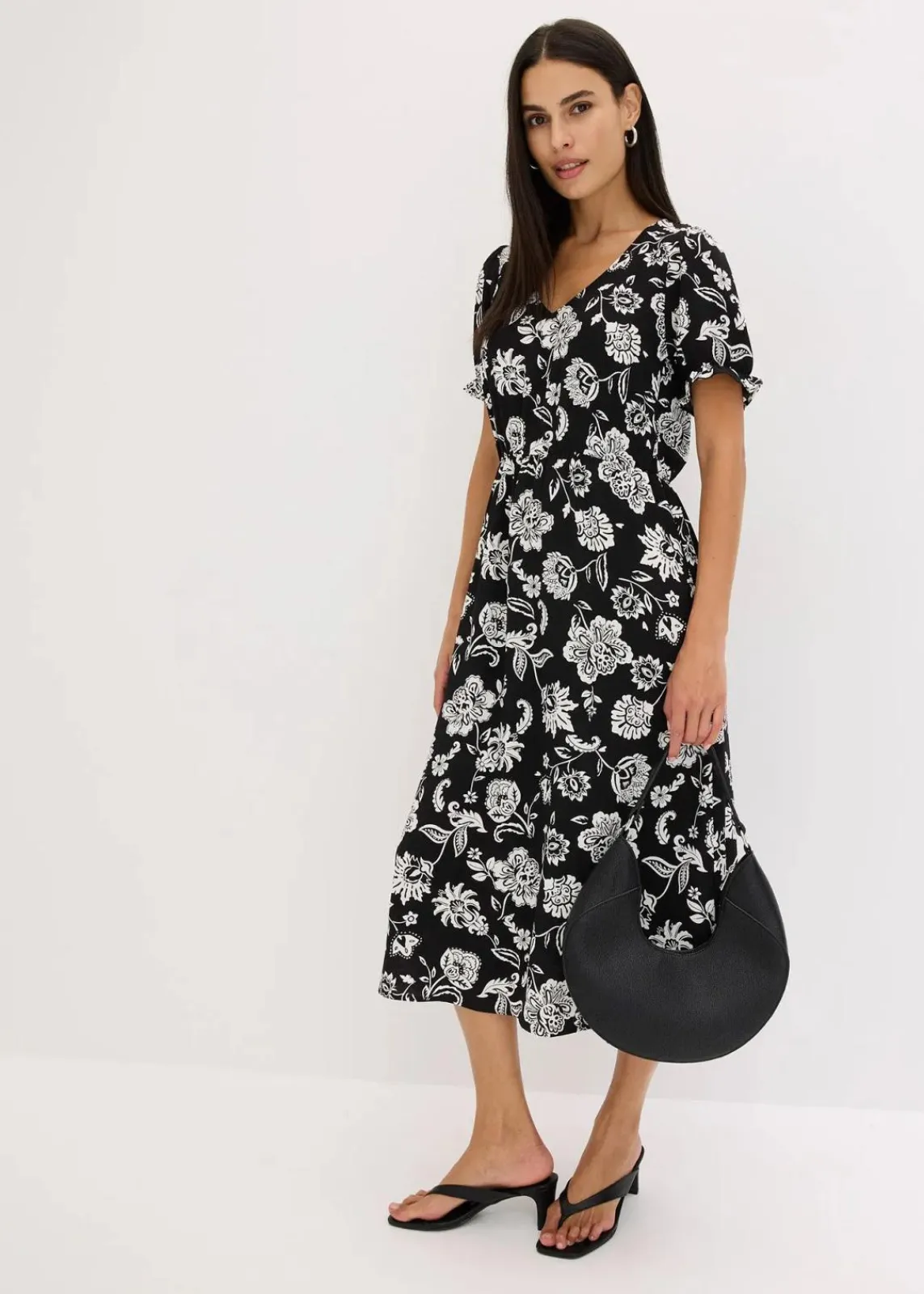 floral bedrucktes Midikleid mit Puffärmeln und kleinen Volants am Ärmelsaum