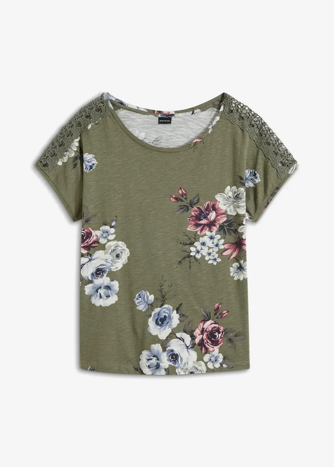 Modernes Shirt von BODYFLIRT. Das Shirt ist mit Spitze auf der Schulter verziert. Länge in Gr. 36/38 ca. 64 cm.