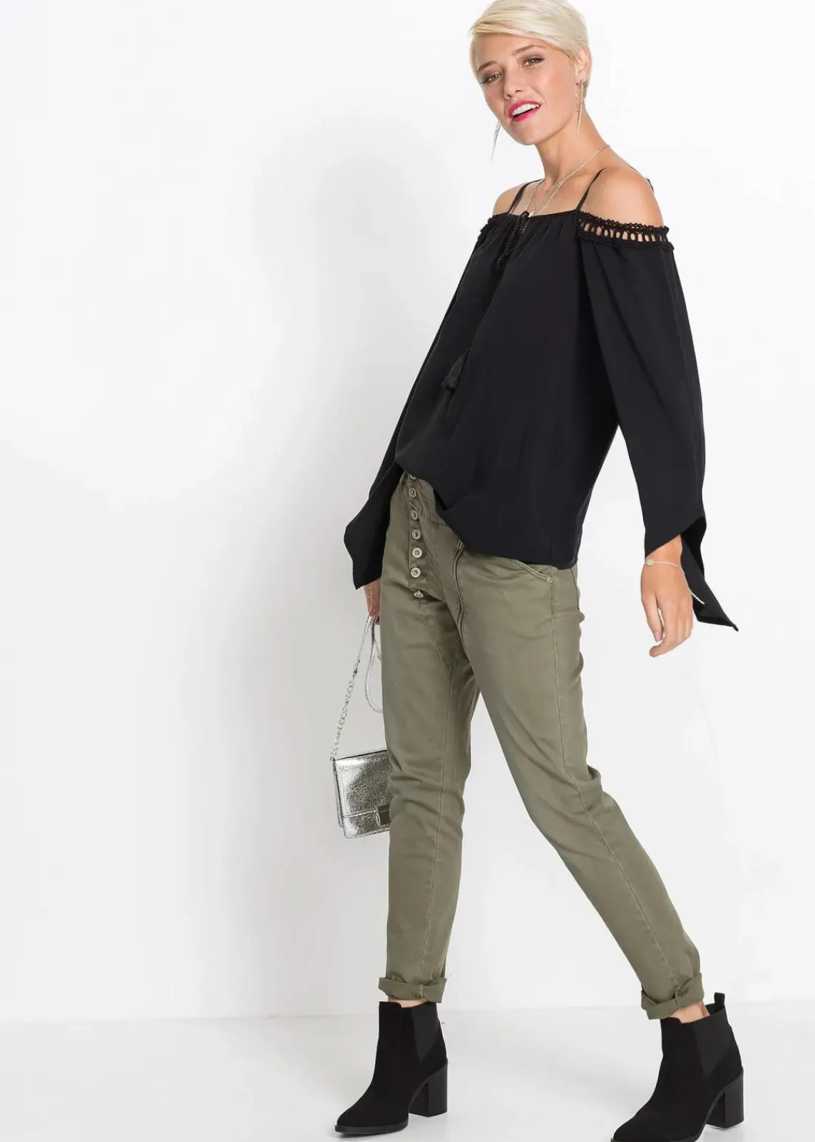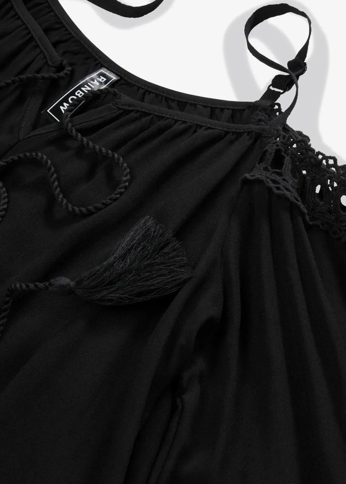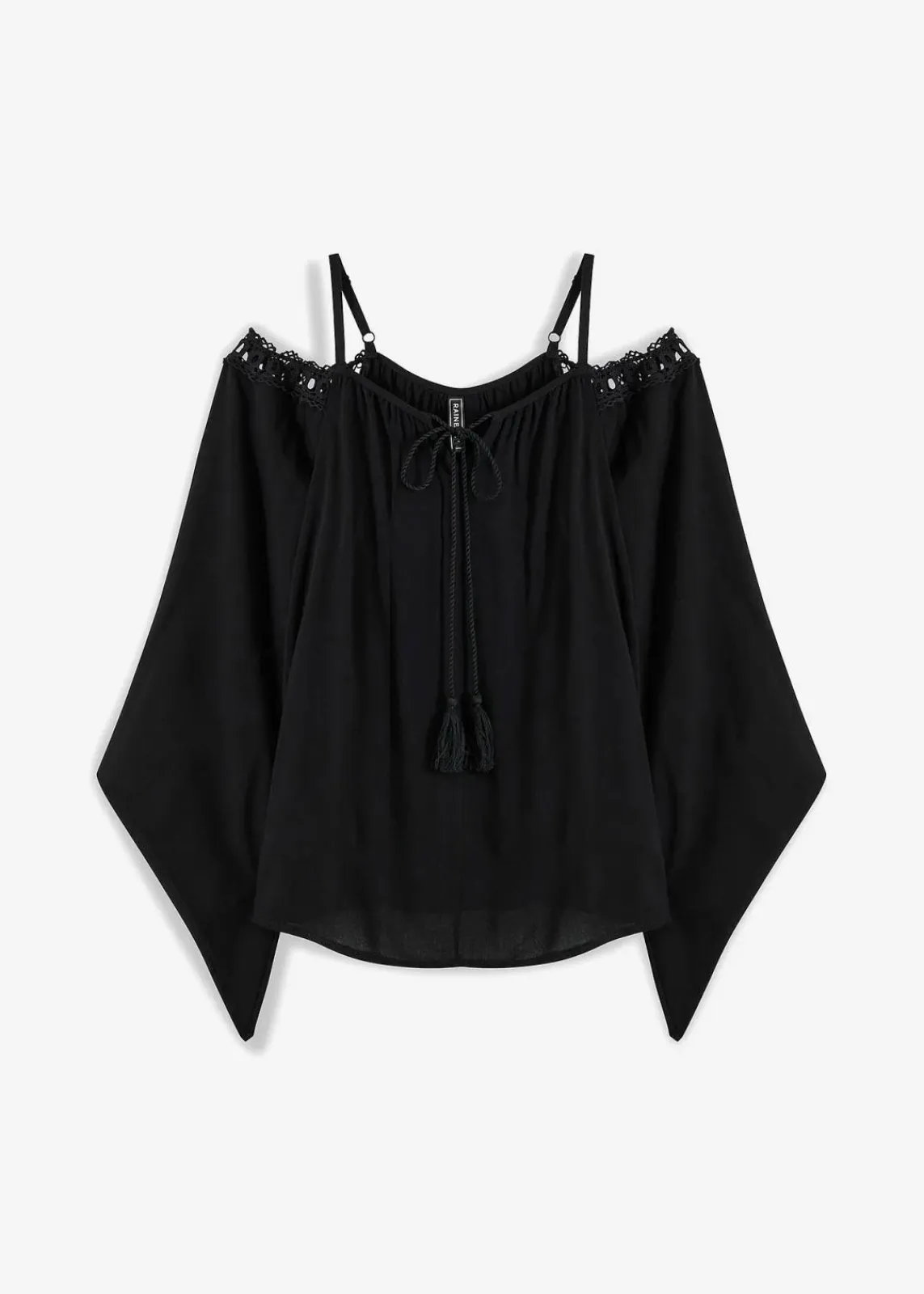 Ein Must-Have für coole Fashionistas ist diese stylishe Bluse. Das lässig geschnittene Modell mit Carmen-Ausschnitt bezaubert mit dekorativer Spitze an den Schultern. Die zusätzlichen schmalen Träger sind stufenlos verstellbar.Verspieltes Detail ist das mit Quasten verzierte lange Bindeband am leicht gerafften Ausschnitt. Die asymmetrisch geschnittenen Flügelärmel verleihen dem angesagten Oberteil einen besonderen Look.