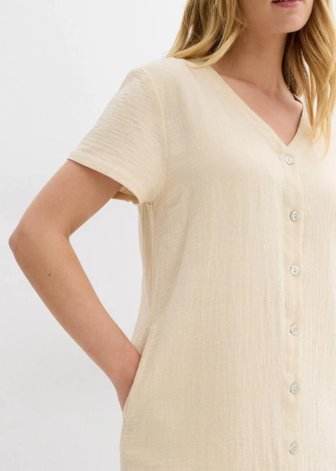 - Passformvorteile:hüftbedeckend, mehr Komfort durch Seitenschlitze, streckender V-Ausschnitt, umspielt den Bauch, umspielt den Po, umspielt die Hüfte, umspielt die Oberschenkel, Vorderverschluss