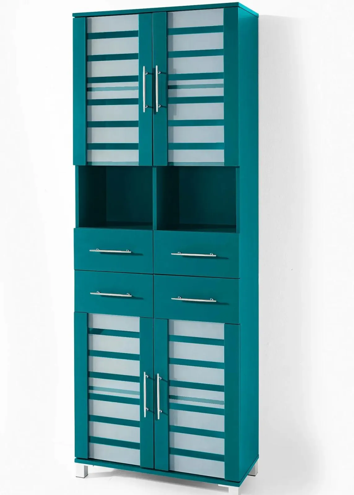 Moderner Hochschrank mit reichlich Stauraum. Die Fronten sind aus Glas, das teilweise gefrostet wurde. Mit 4 Türen mit je 1 Einlegeboden, 2 offenen Fächern und 2 Schubladen. Höhe der Füße ca. 6 cm.