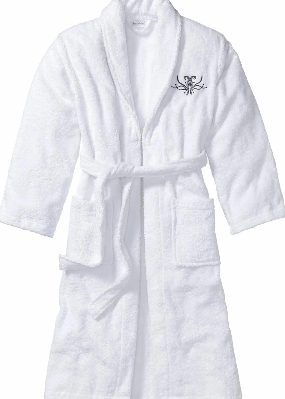Der Frottee Bademantel ist aus flauschiger Baumwolle gefertigt und sorgt für ein behagliches Tragegefühl. Das schöne Modell zeigt sich im klassischen Schnitt mit einem Bindeband zum Fixieren und mit zwei aufgesetzten Taschen vorne. Die kleine Stickerei neben dem Kragen setzt einen stilvollen Akzent. Als komfortabler Begleiter beim Saunagang macht der Bademantel eine gute Figur.