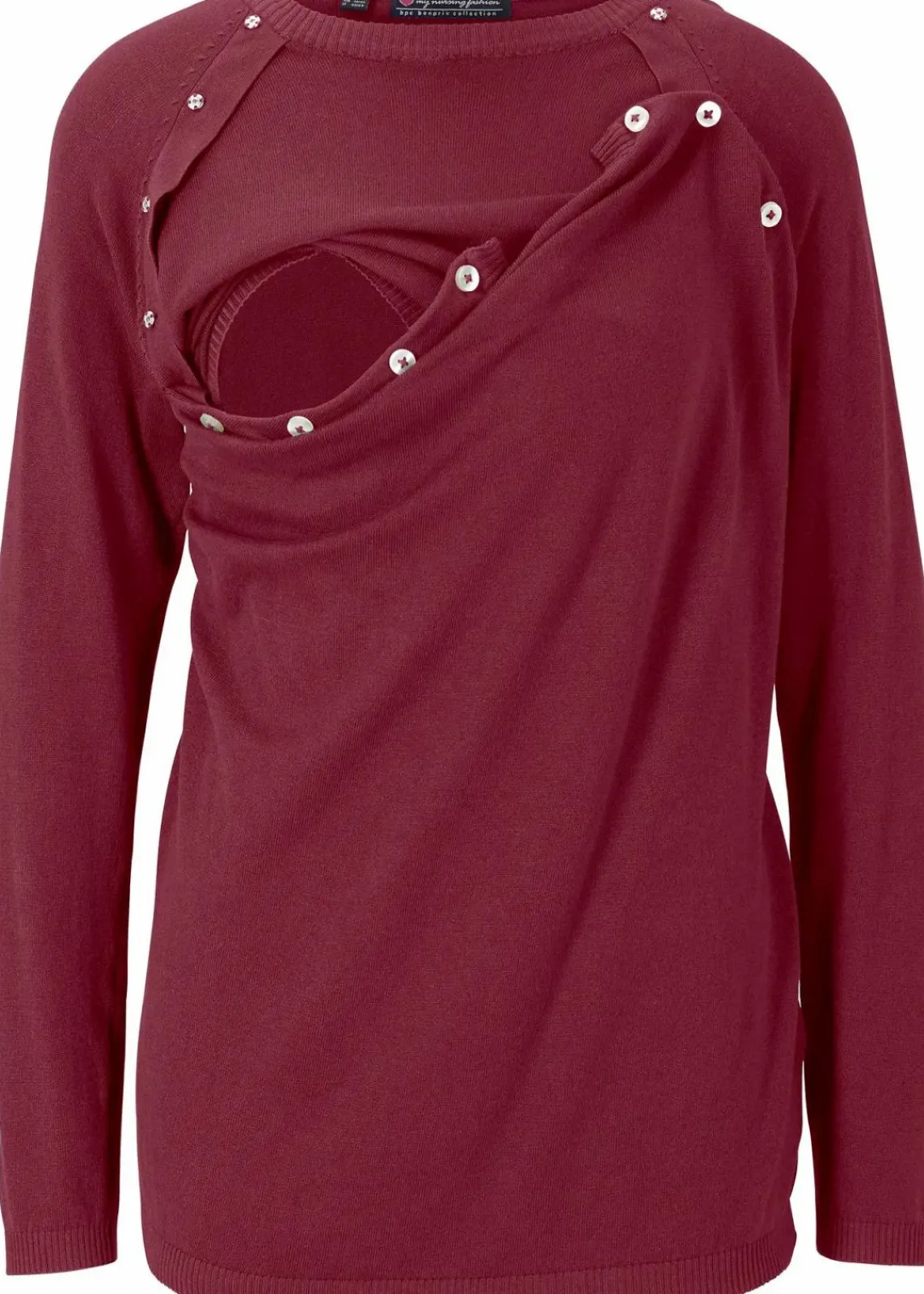 Weicher Pullover mit Rundhals-Ausschnitt in hüftbedeckender Länge und langen Ärmeln. Das Oberteil hat einen Einsatz zum Aufknöpfen. Das Design mit den doppelten Lagen hilft Wärmeverlust zu vermeiden und ermöglicht ein angenehmes und diskretes Stillen für Mutter und Kind.