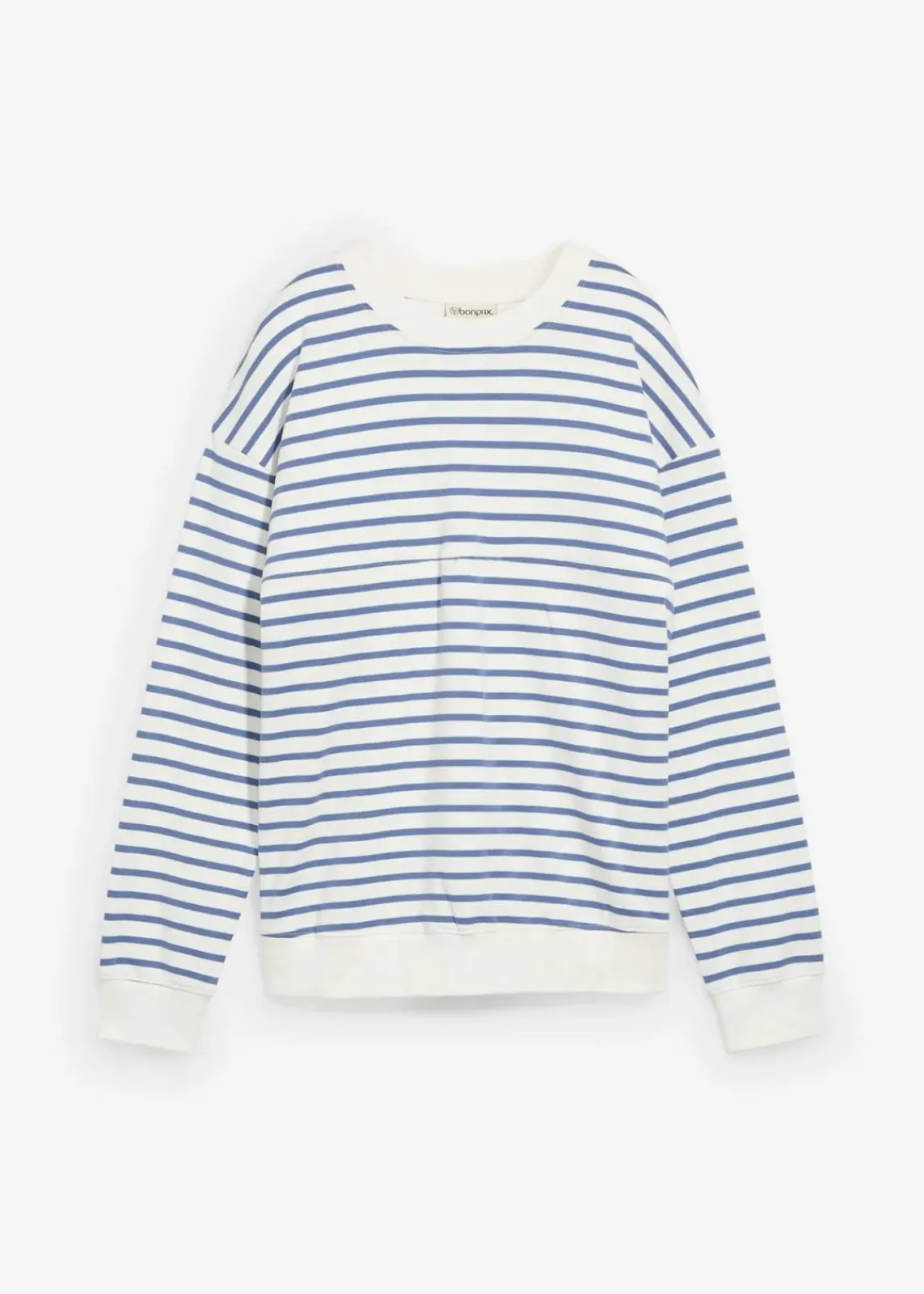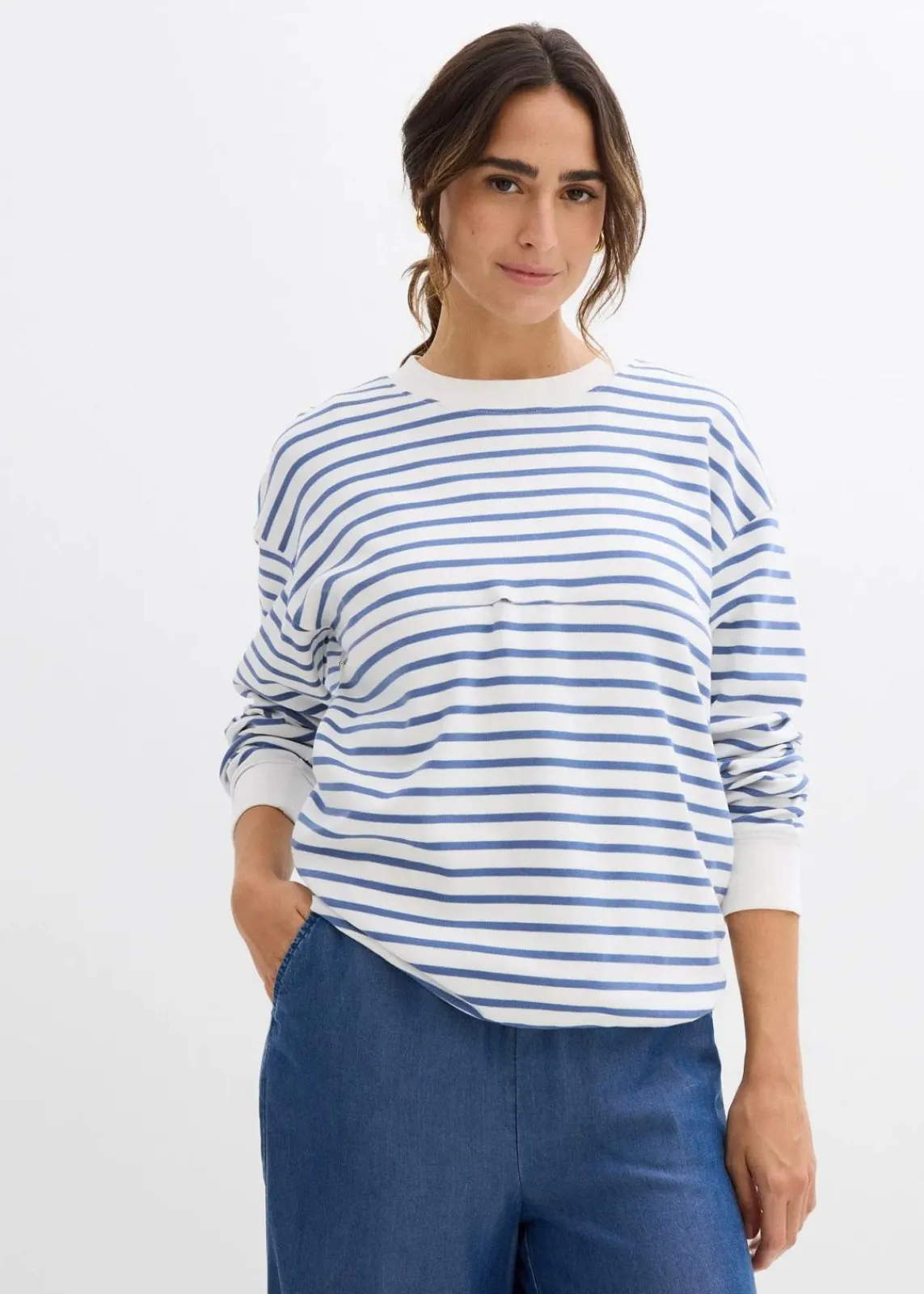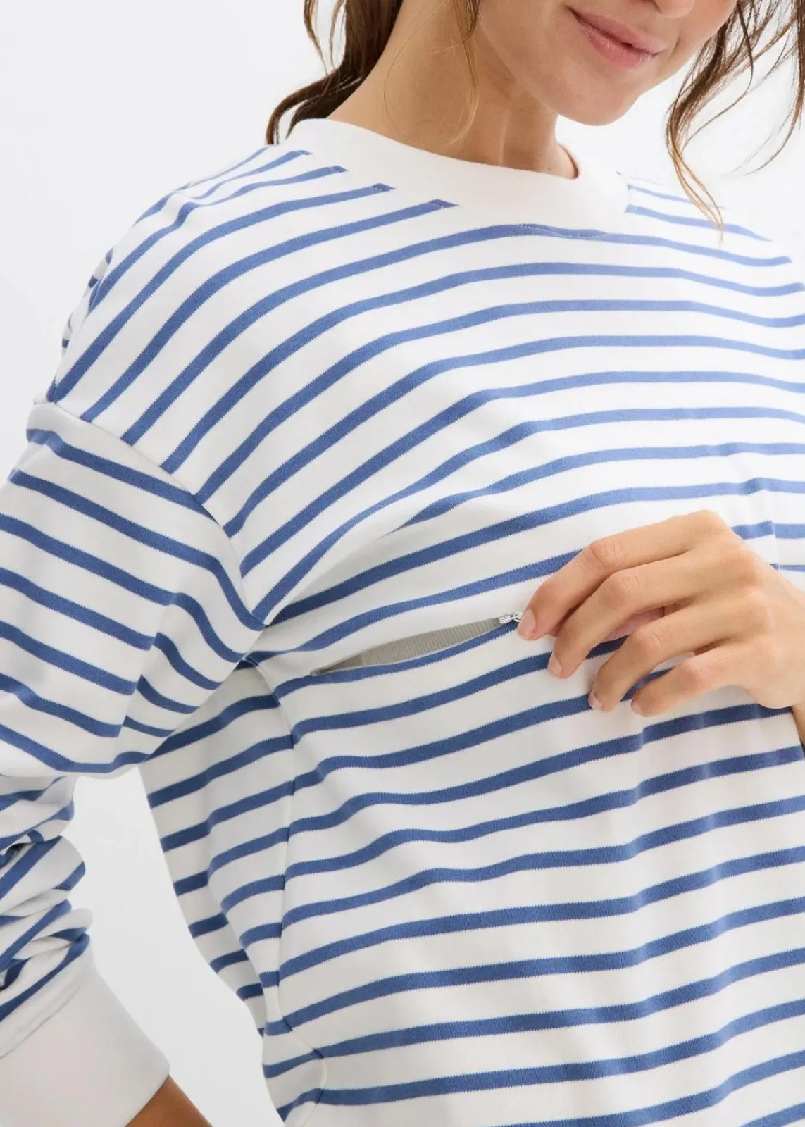 Gestreiftes Umstandsshirt aus weichem, dicht gewebtem Jersey aus Bio-Baumwolle mit äußerst diskreter Stillfunktion: Reißverschlüsse auf beiden Seiten ermöglichen ein komfortables und unkompliziertes Stillen für Mutter und Kind.