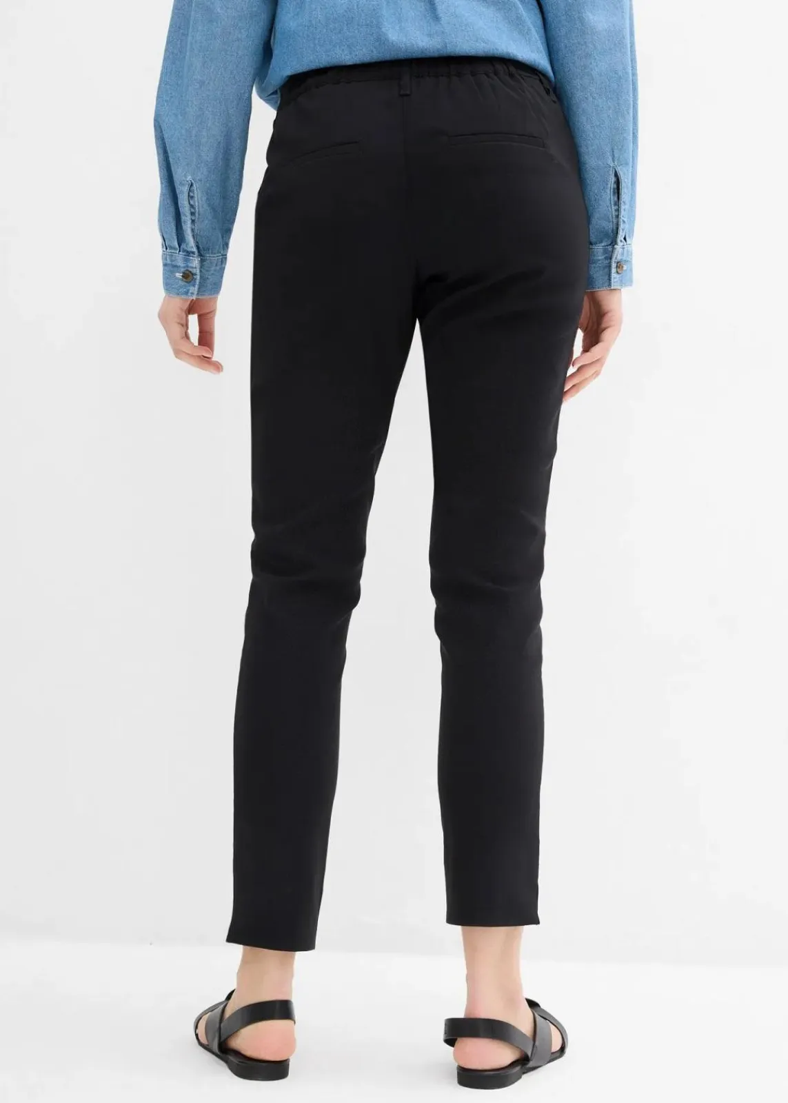 Bequeme Hose aus Bengalin mit Elasthan für einen hohen Tragekomfort. Vorn verfügt sie über verdeckte Gummizüge, die eine individuelle Anpassung der Bauchweite ermöglichen, während der elastische Gummizug hinten für zusätzlichen Komfort sorgt. Schräg angesetzte Seitentaschen und dezente Leistentaschen hinten verleihen der Hose eine raffinierte Note, während kleine Schlitze am Saum das Design stilvoll abrunden. Ein weicher Jersey-Bund garantiert zudem eine perfekte Passform am Bauch und rundet das Gesamtbild harmonisch ab.