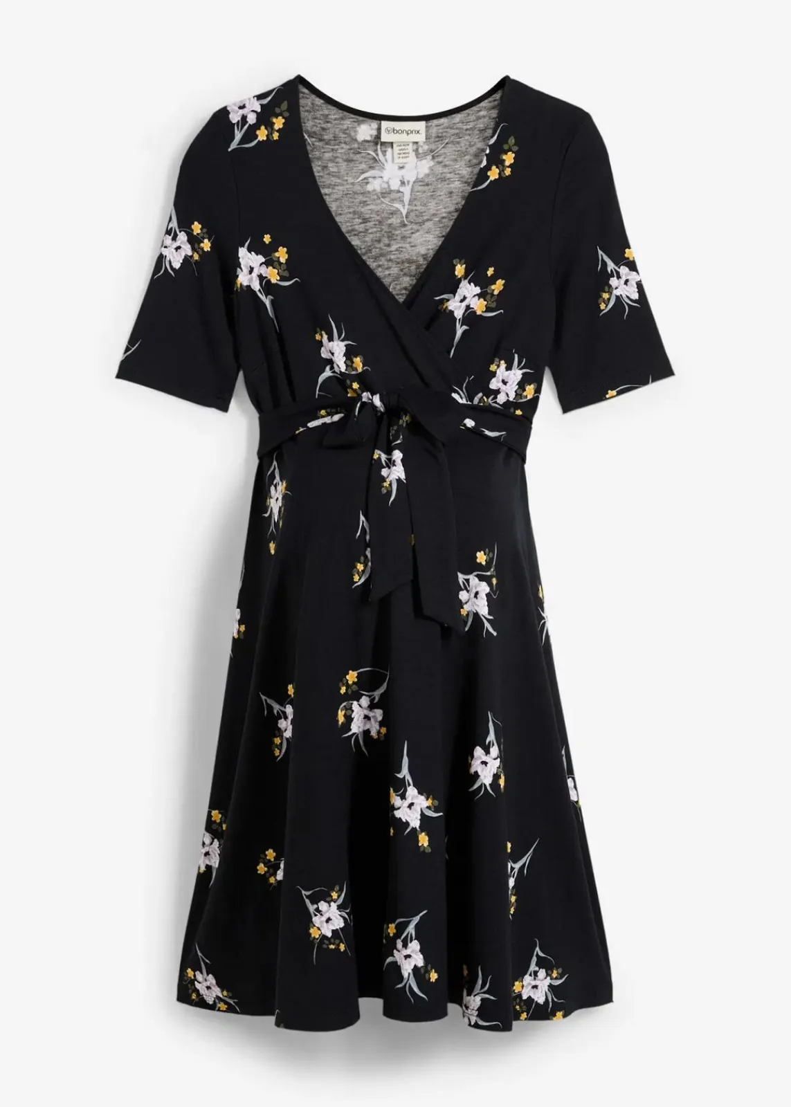 Knieumspielendes Kleid aus Viskose mit Stetch für einen hohen Tragekomport. Mit einem Oberteil im Wickelschnitt mit V-Ausschnitt und figurschmeichelnden halblangen Ärmeln. Das abnehmbare Bindeband betont den wachsenden Baby-Bauch und dient der Regulierung der Weite.