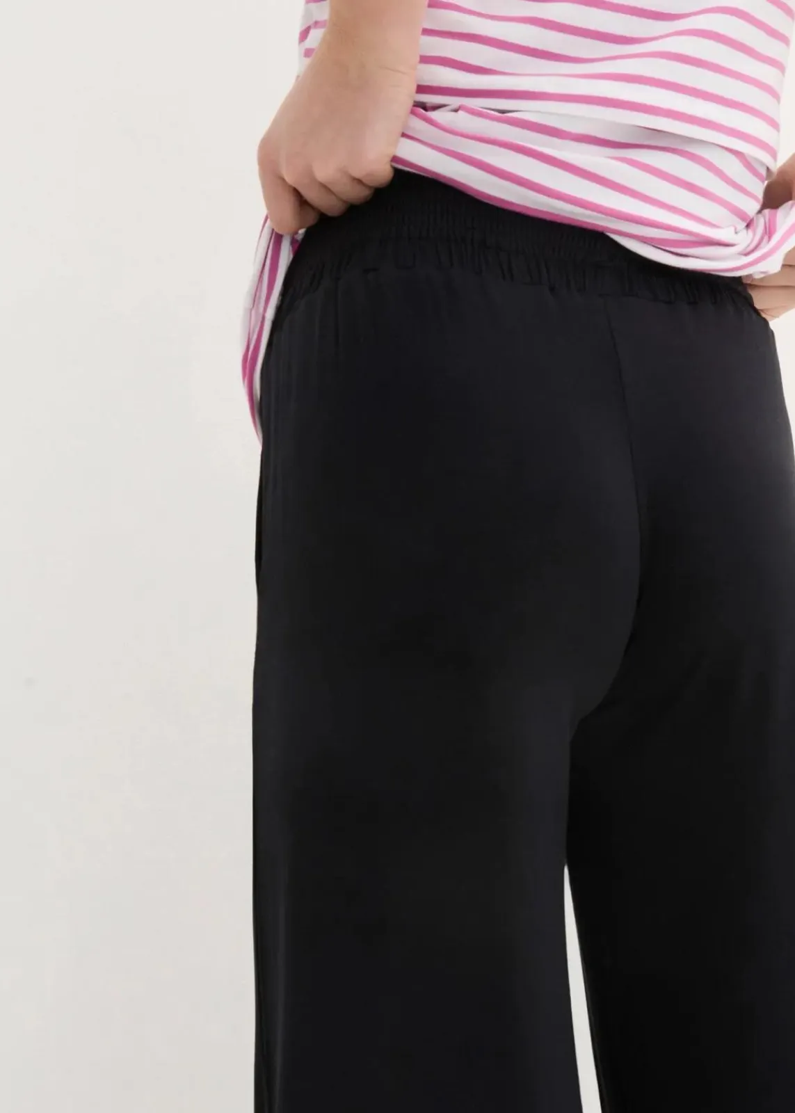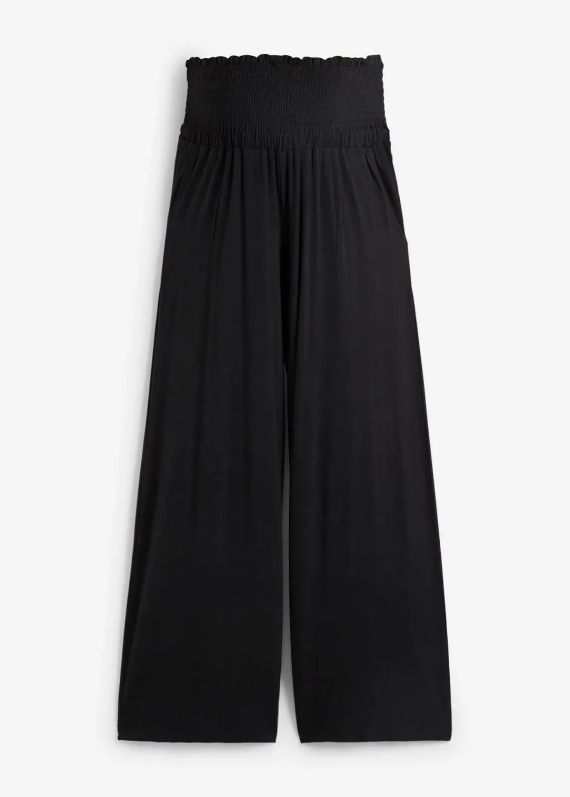 Weiche Jerseyhose aus weicher Viskose mit etwas Stretch für einen hohen Tragekomfort mit einem angesetztem Smock-Bund, der sich sanft dem jeweiligen Schwangerschaftsmonat anpasst. Mit praktischen Eingriffstaschen vorne. Bequeme Passform mit weitem, knöchelfreiem Bein.