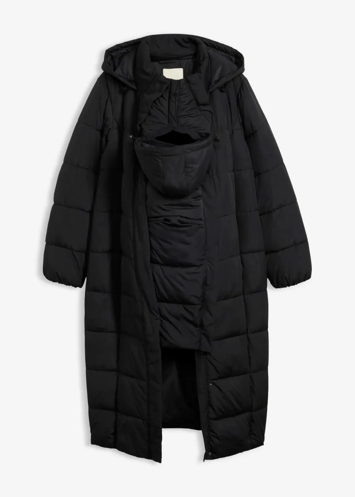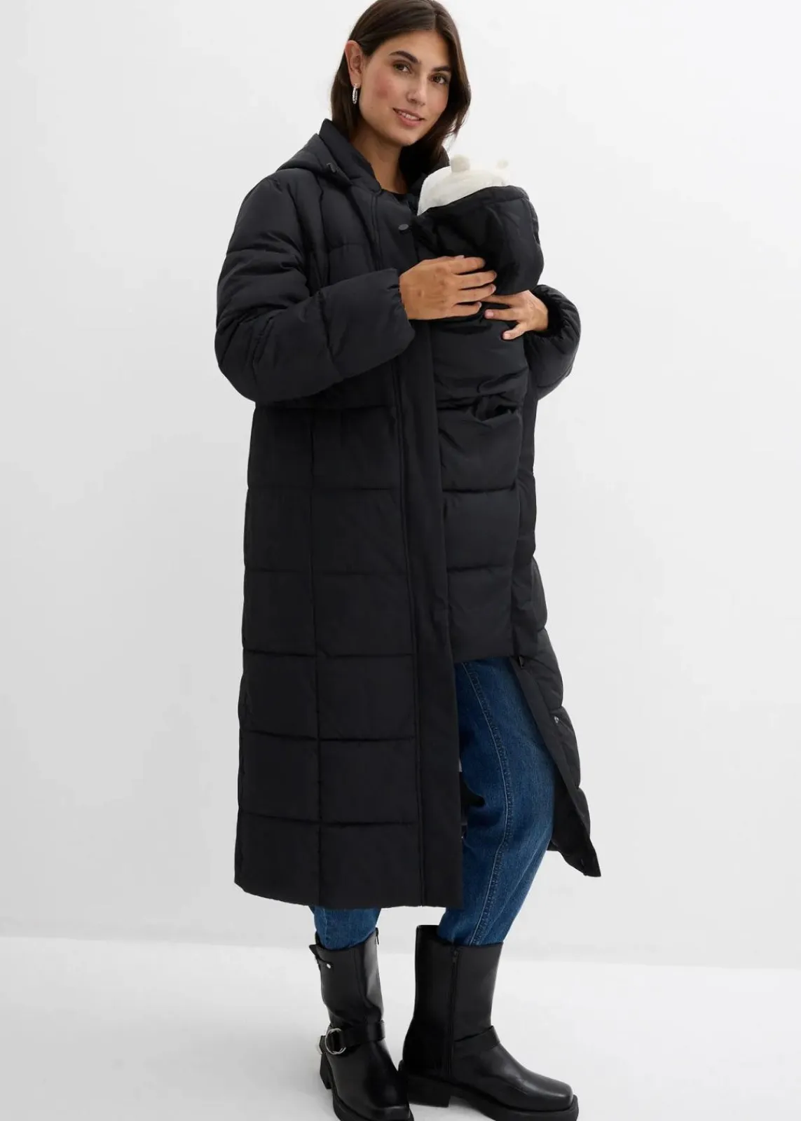 Dieser warm wattierte Mantel in bequemer Oversize-Passform für die Schwangerschaft und Tragezeit. Eingriffstaschen bieten Platz für wichtige Kleinigkeiten im Alltag. Der Trageeinsatz ist so gestaltet, dass er den Hals der Mutter angenehm wärmt, und verfügt über verdeckte Druckknöpfe sowie eine Babykapuze mit verstellbarem Kordelzug. Eine extra große Kapuze für die Mutter schützt zuverlässig bei Wind und Wetter. Ein praktischer Zwei-Wege-Reißverschluss sorgt für mehr Bewegungsfreiheit, während elastische Bündchen an den Ärmeln Kälte und Wind zuverlässig abhalten.