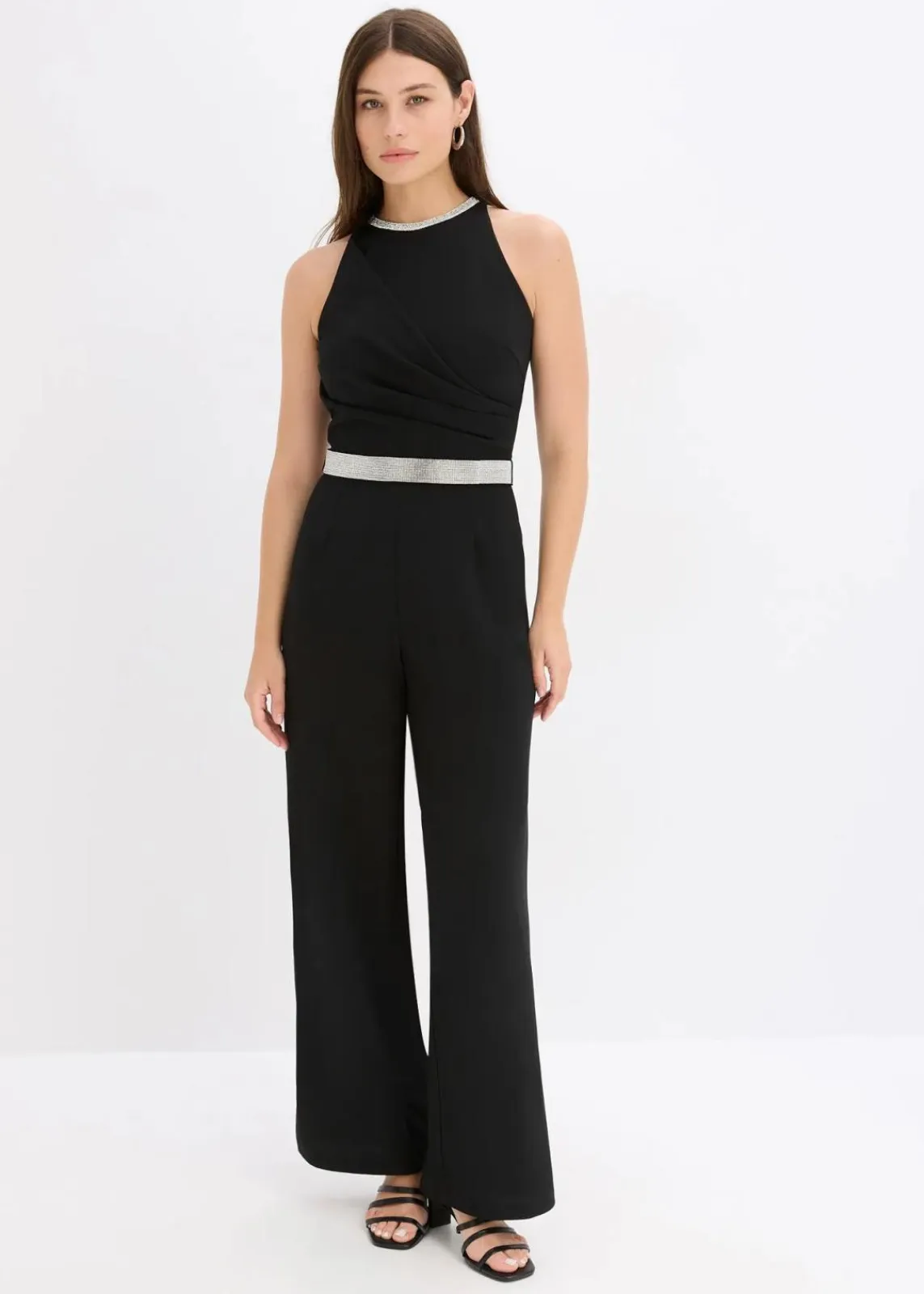 Modern und feminin: Overall aus strukturiertem Crepe mit Strassstein-Besatz am Ausschnitt und an der Taille
