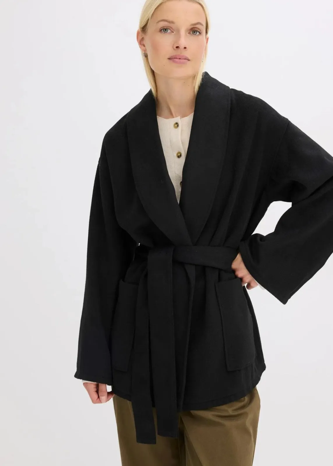 Lässige Wolljacke mit Bindeband und aufgesetzten Taschen