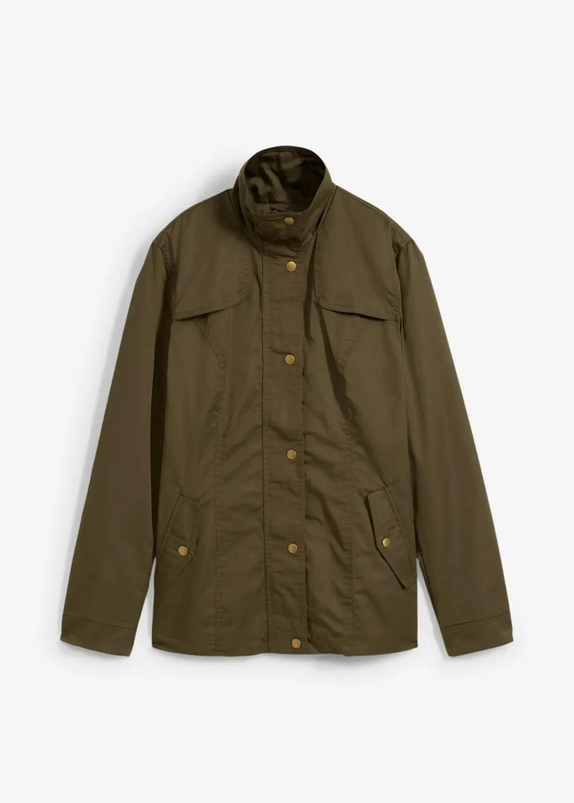 Leicht kaschierende Jacke mit Stehkragen. Die Jacke schließt vorne mit einem Reißverschluss sowie einer Druckknopfleiste. Die seitlichen Taschen sind mit einem Druckknopf versehen. Der Stehkragen schützt vor Wind und Wetter.