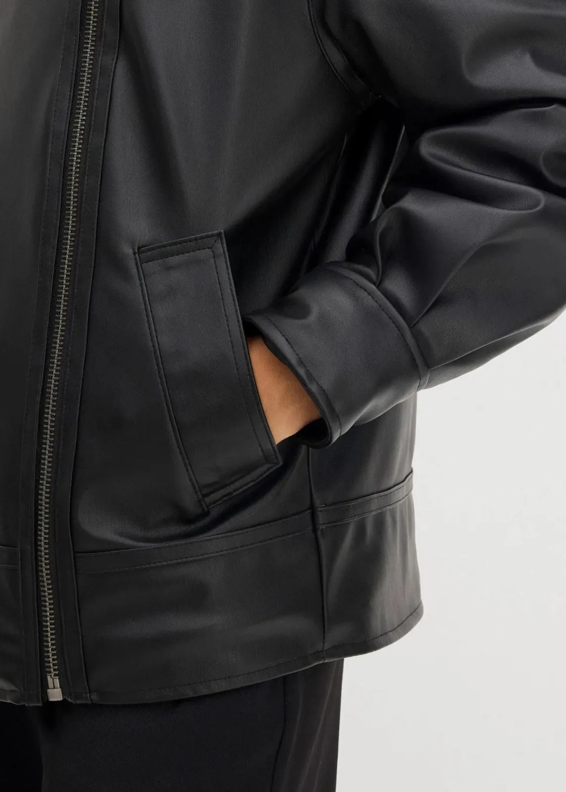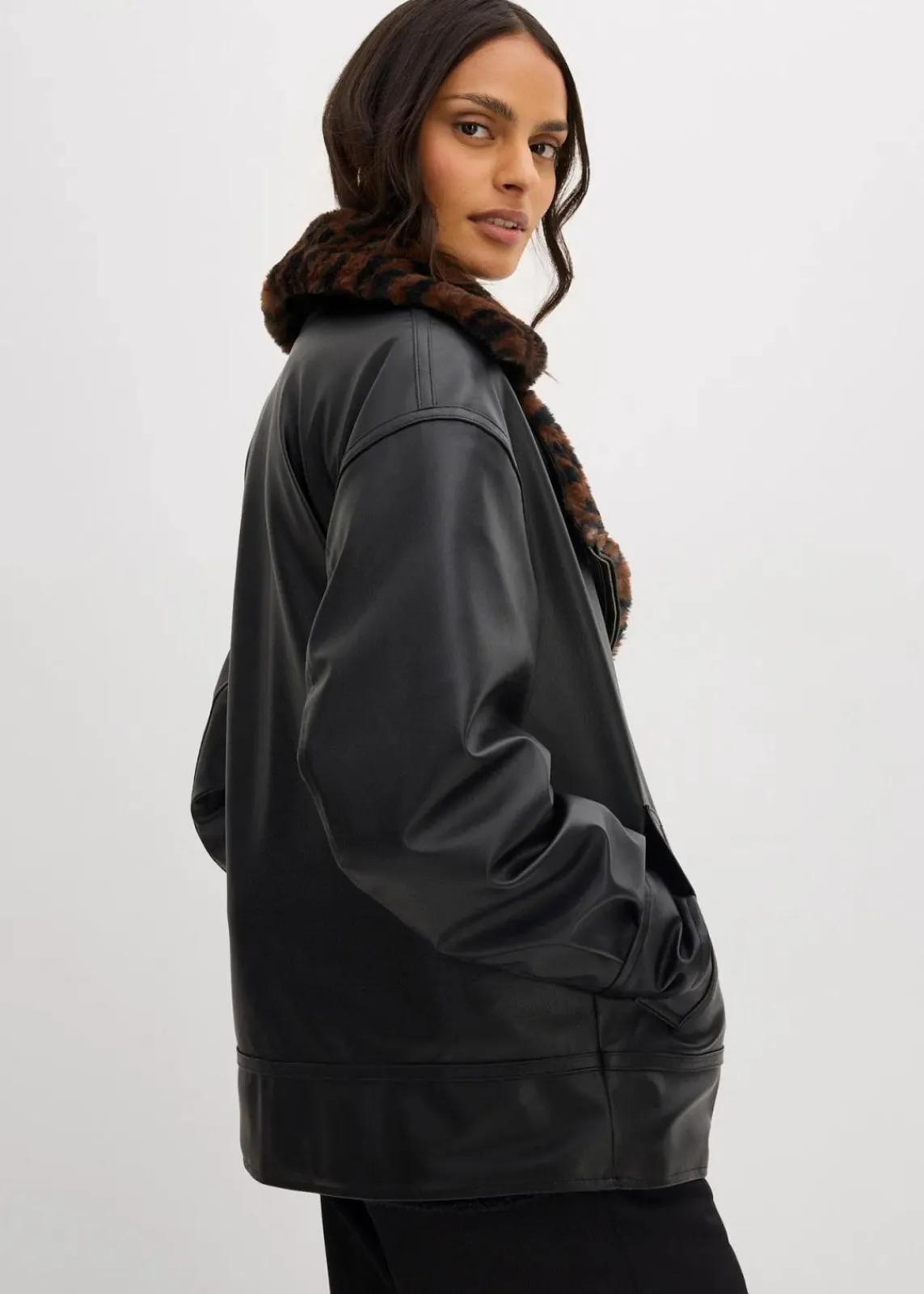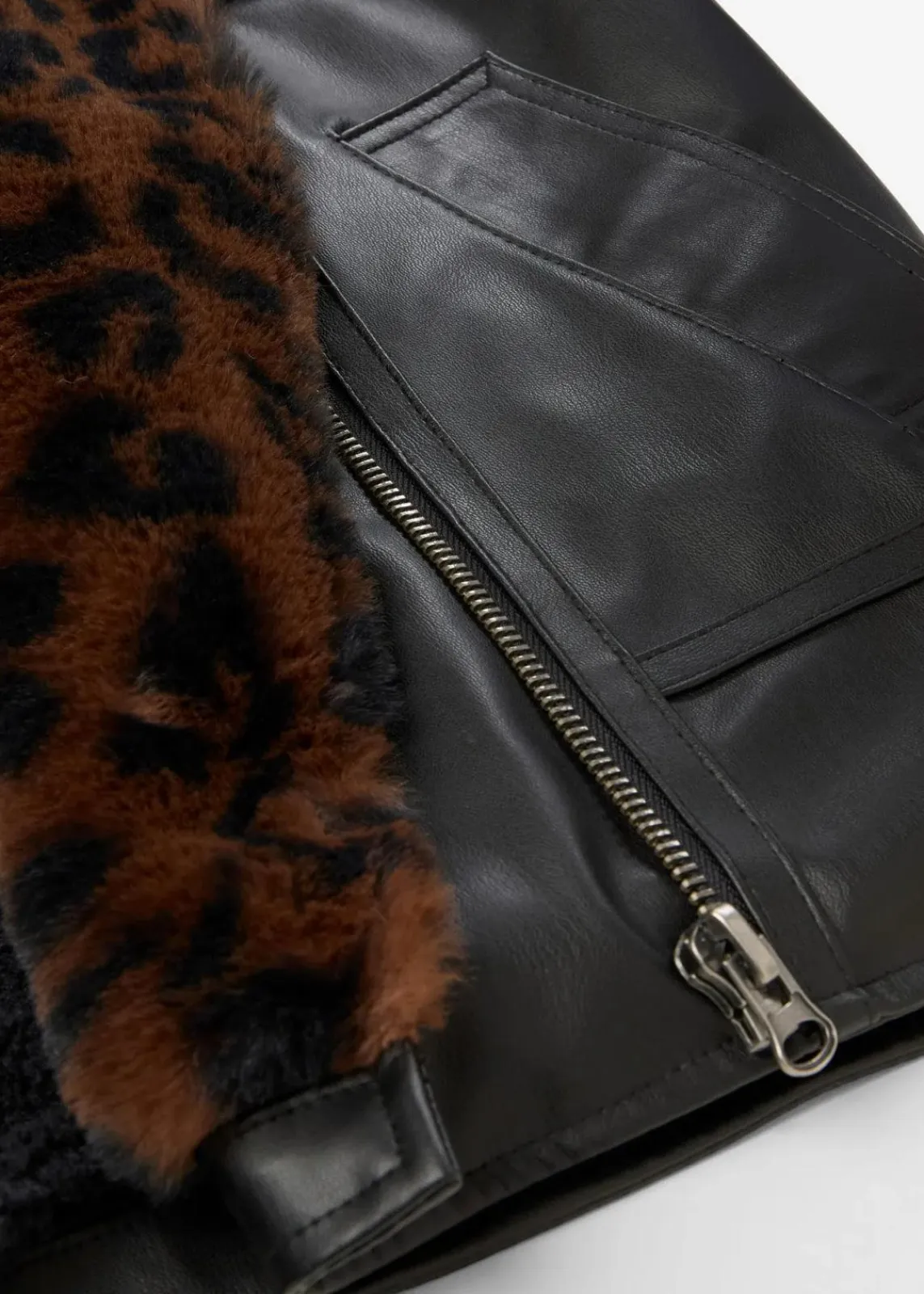 Trendige Oversize Lederimitat-Jacke mit Leoparden Kunstfell
