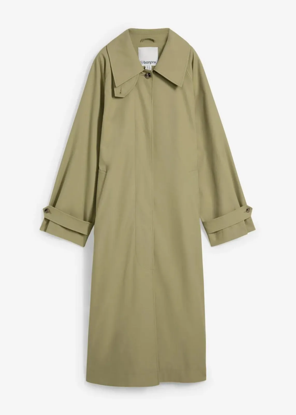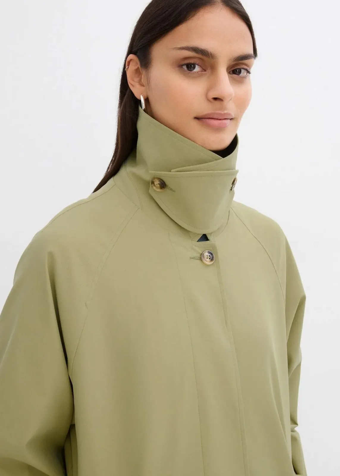 Weit geschnittener Trenchcoat mit gerade Silhouette, breitem hochklappbarem Kragen und verstellbaren Ärmelaufschlägen