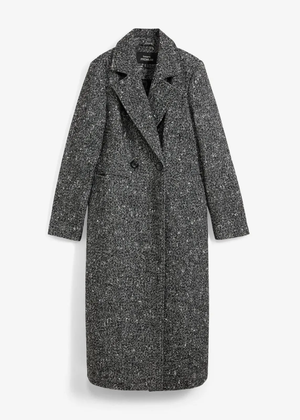 stillvoller Mantel aus hochwertiger Wollmischung in Salz und Pfeffer Optik, doppelreihig geknöpft