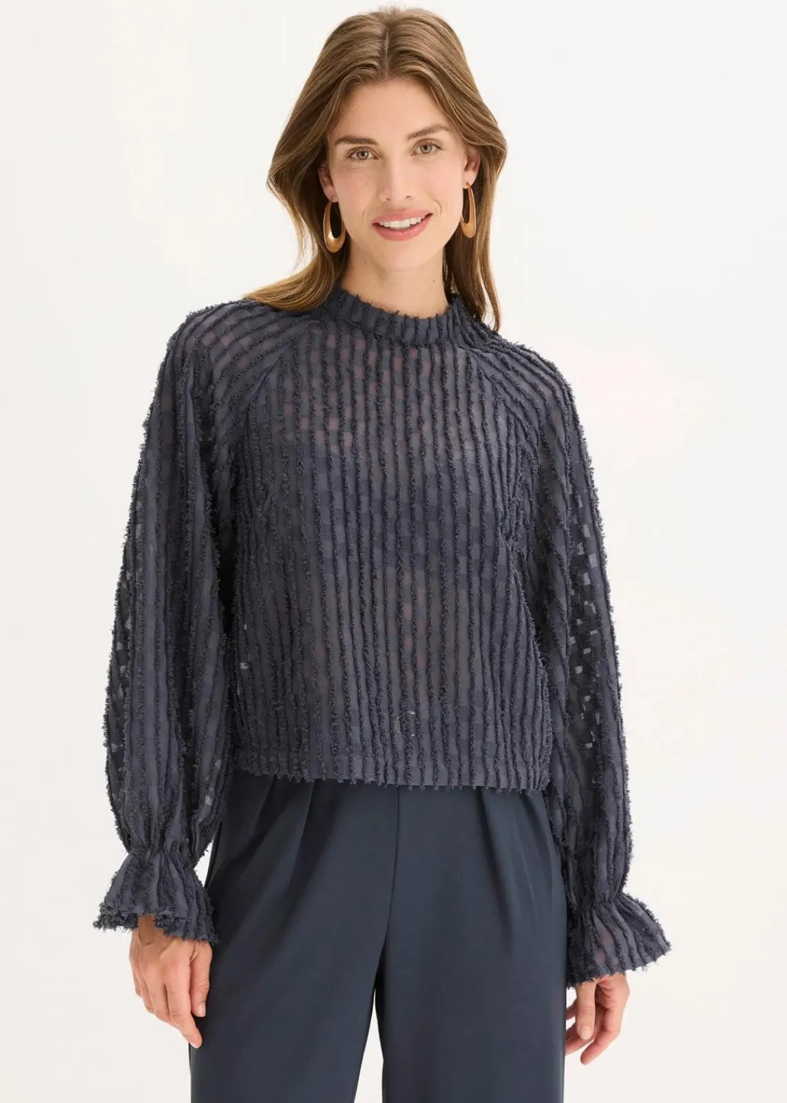 Blusentop mit kleinem Stehkragen und elastischem Rüschenabschluss am Ärmel