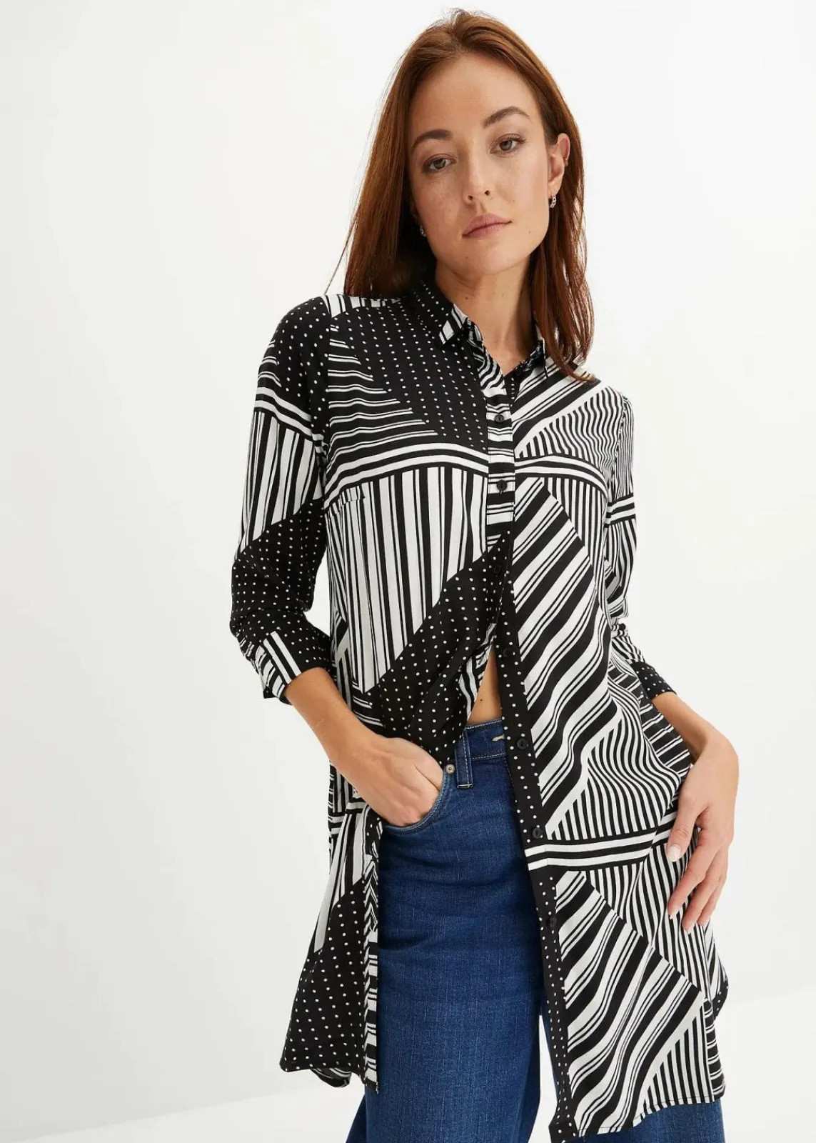 Diese Longbluse ist durch ihren angesagten Schnitt sowohl stylisch als auch schick und lässt sich mit einer Leggins oder Jeans perfekt kombinieren. Länge in Gr. 38 ca. 96 cm.