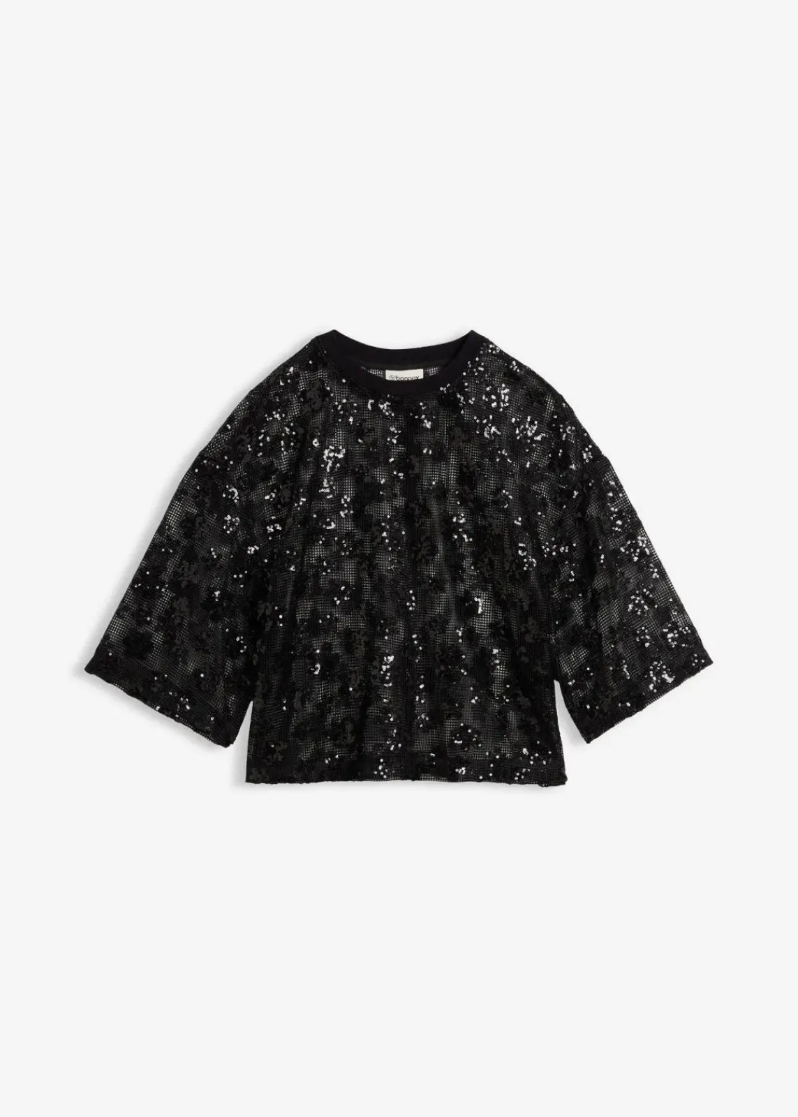 Weites Blusenshirt im Netz-Look und aufwendigen Paillettenblumen