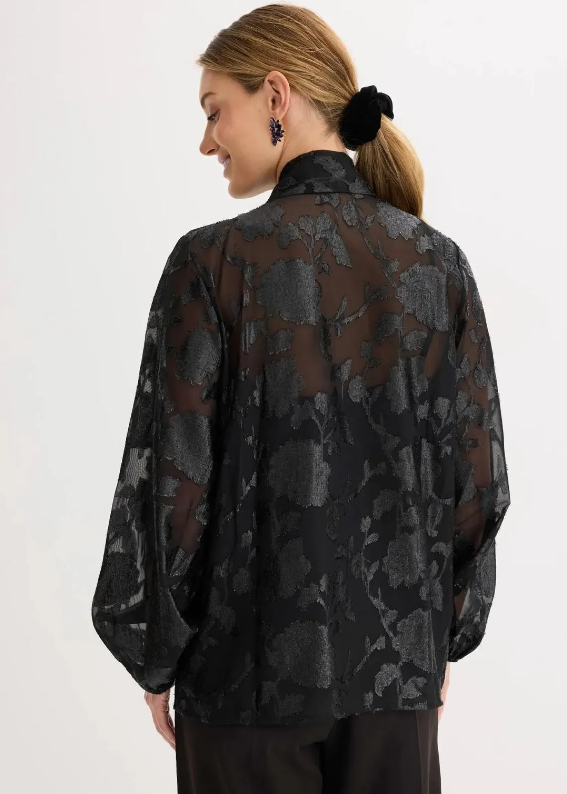 Modern und feminin: Bluse floraler Stickerei mit Glanz und Binde-Detail am Kragen