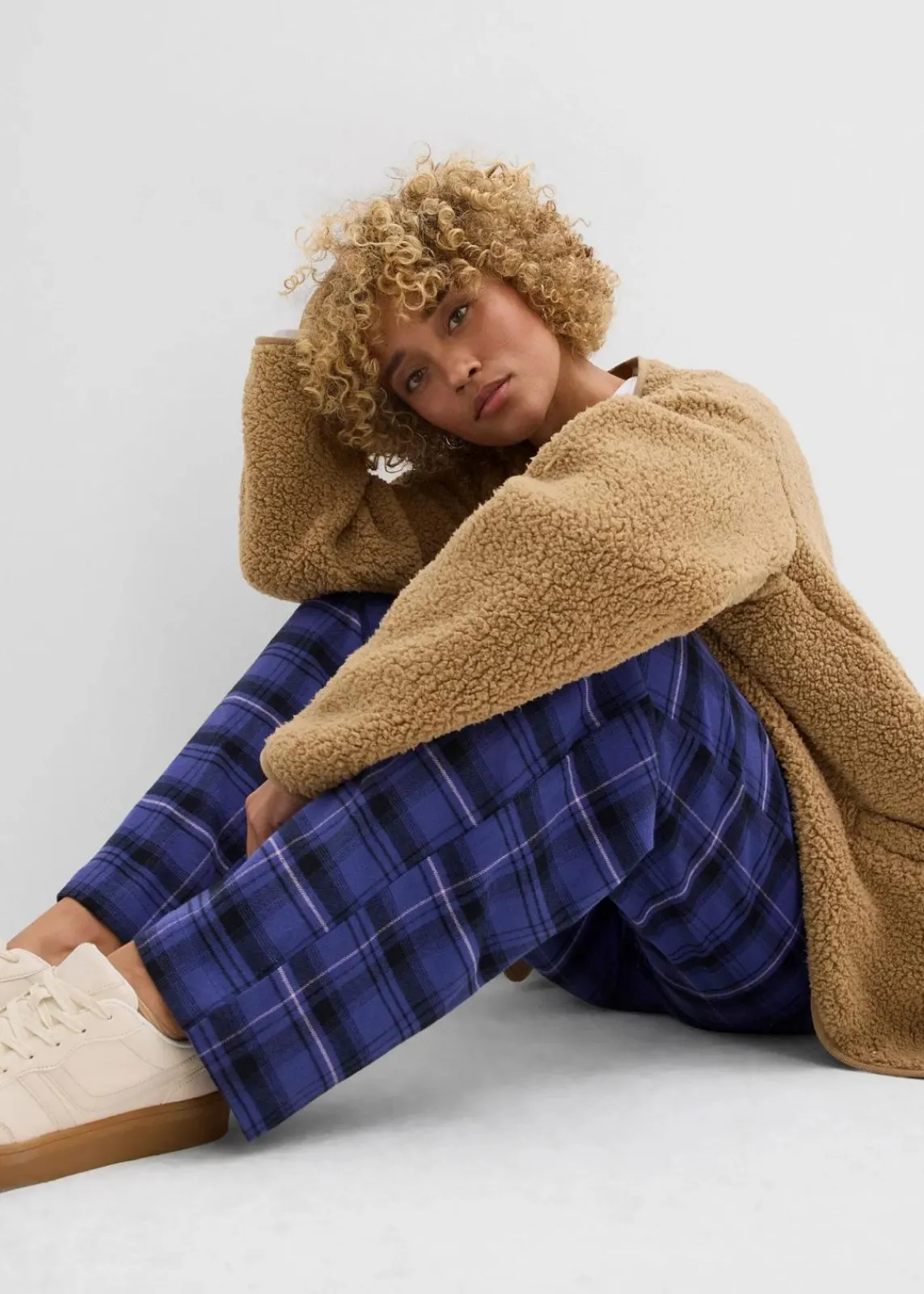Flanellhose mit hoch geschnittenem, elastischem Bund und seitlichen Eingriffstaschen.