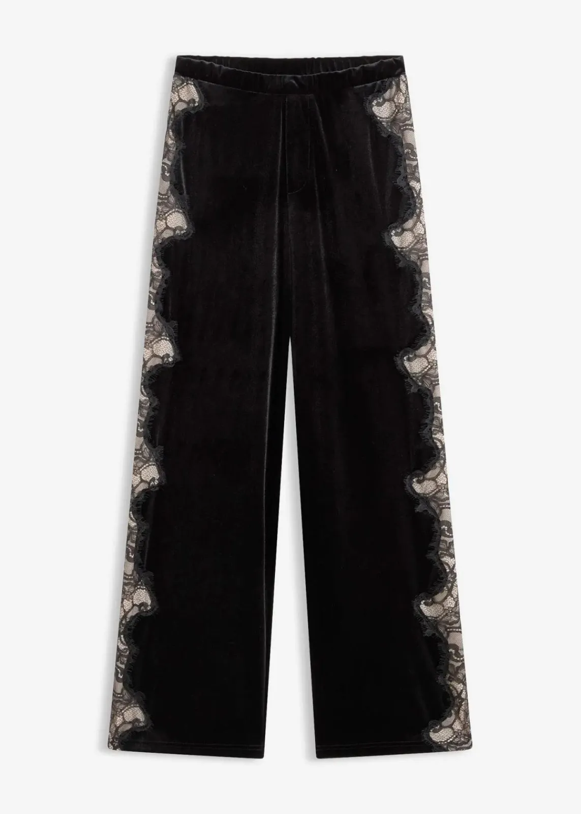 modische Marlenehose aus softem Samt mit dekorativem Spitzeneinsatz an der Seite. Die Spitze ist mit hautfarbenem Mesh unterlegt