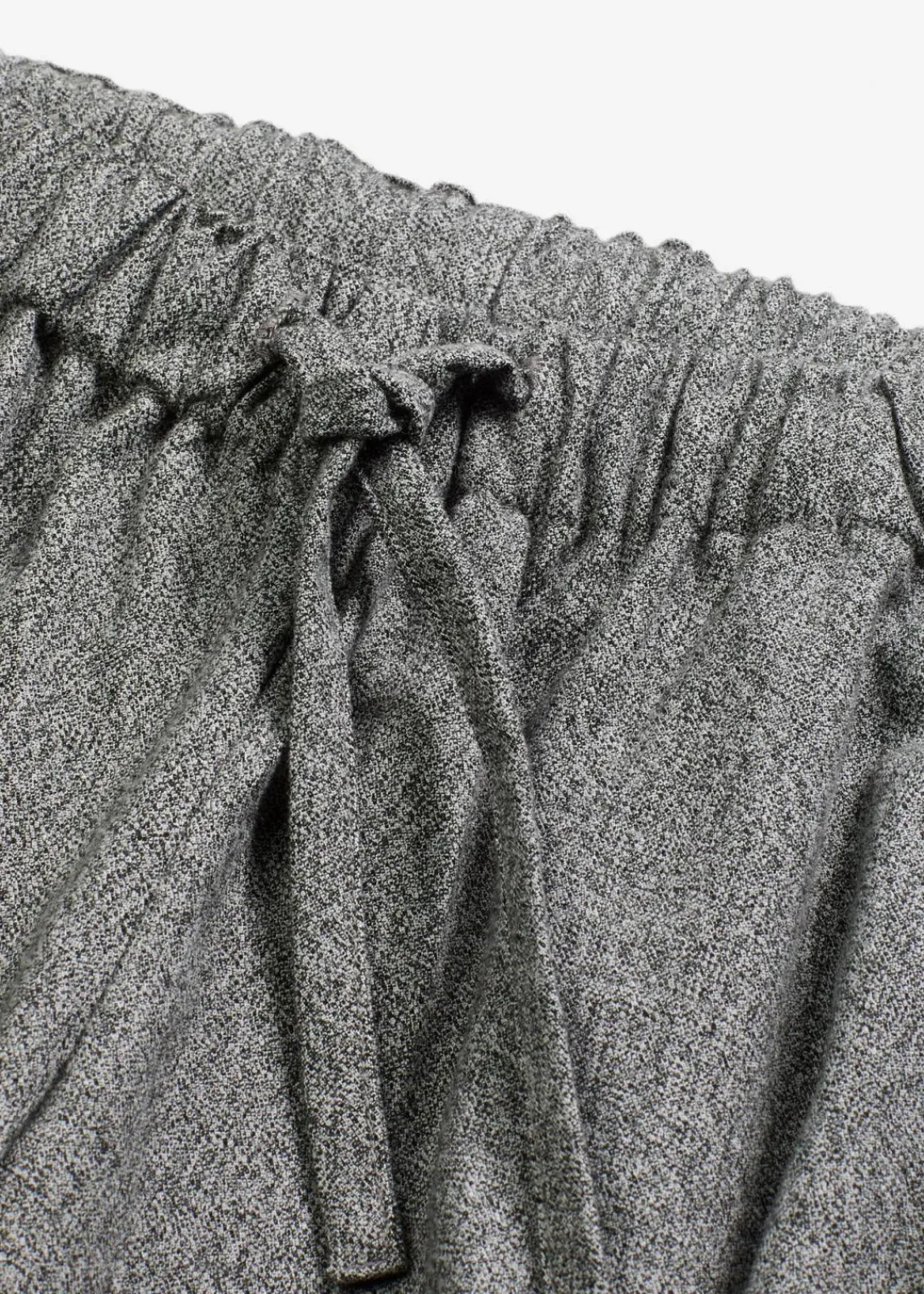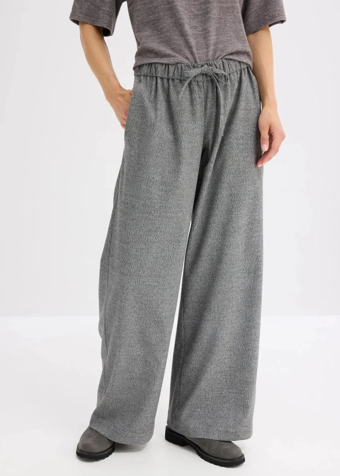 Weit geschnittene Hose in Salz & Pfeffer Optik mit Schnürung am Bund und seitlichen Eingriffstaschen.