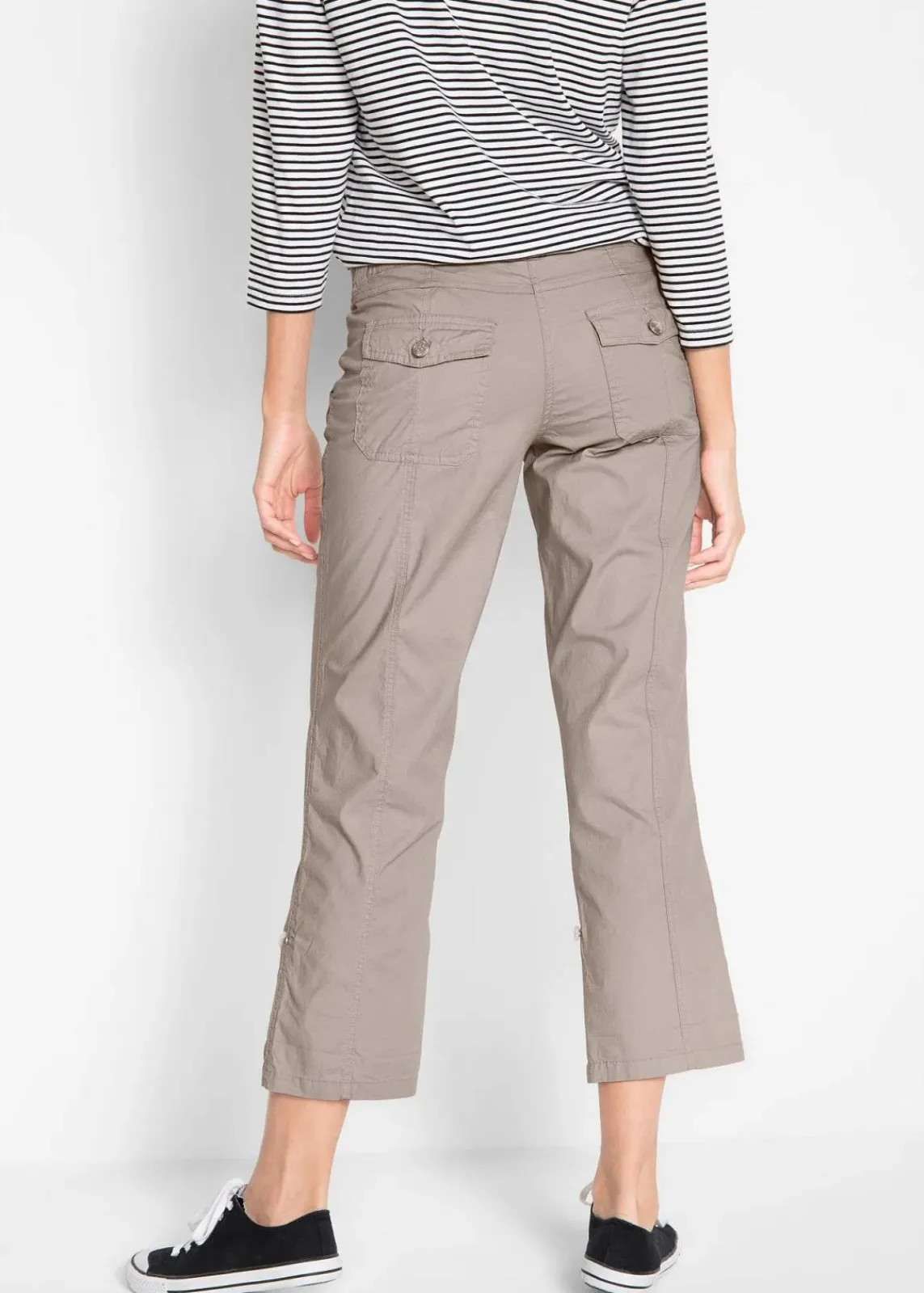 Bequem erweitert diese Stretch-Cargohose in 3/4-Länge den Kleiderschrank um ein Modell für den freizeittauglichen Look. Die Hose der Marke bpc punktet mit praktischen Taschendetails auf der Vorderseite. Zwei weitere Taschen zum Knöpfen finden sich am Gesäß.Die Beinlänge der 3/4-Stretch-Cargohose lässt sich mittels Knopf und Riegeln nach Belieben variieren. Längsnähte im angepassten Farbton strecken optisch das Bein.