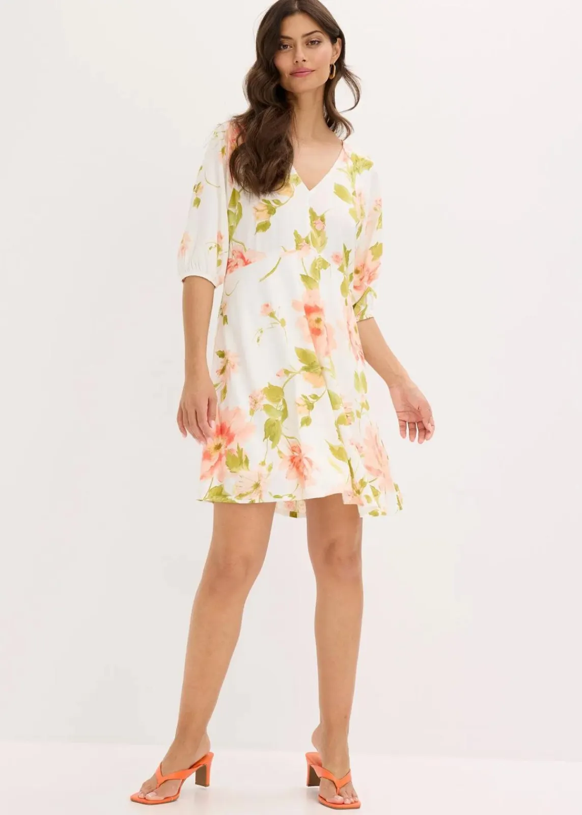 floral bedrucktes Tunika-Kleid aus fließender Viskose mit tiefem V-Ausschnitt vorne