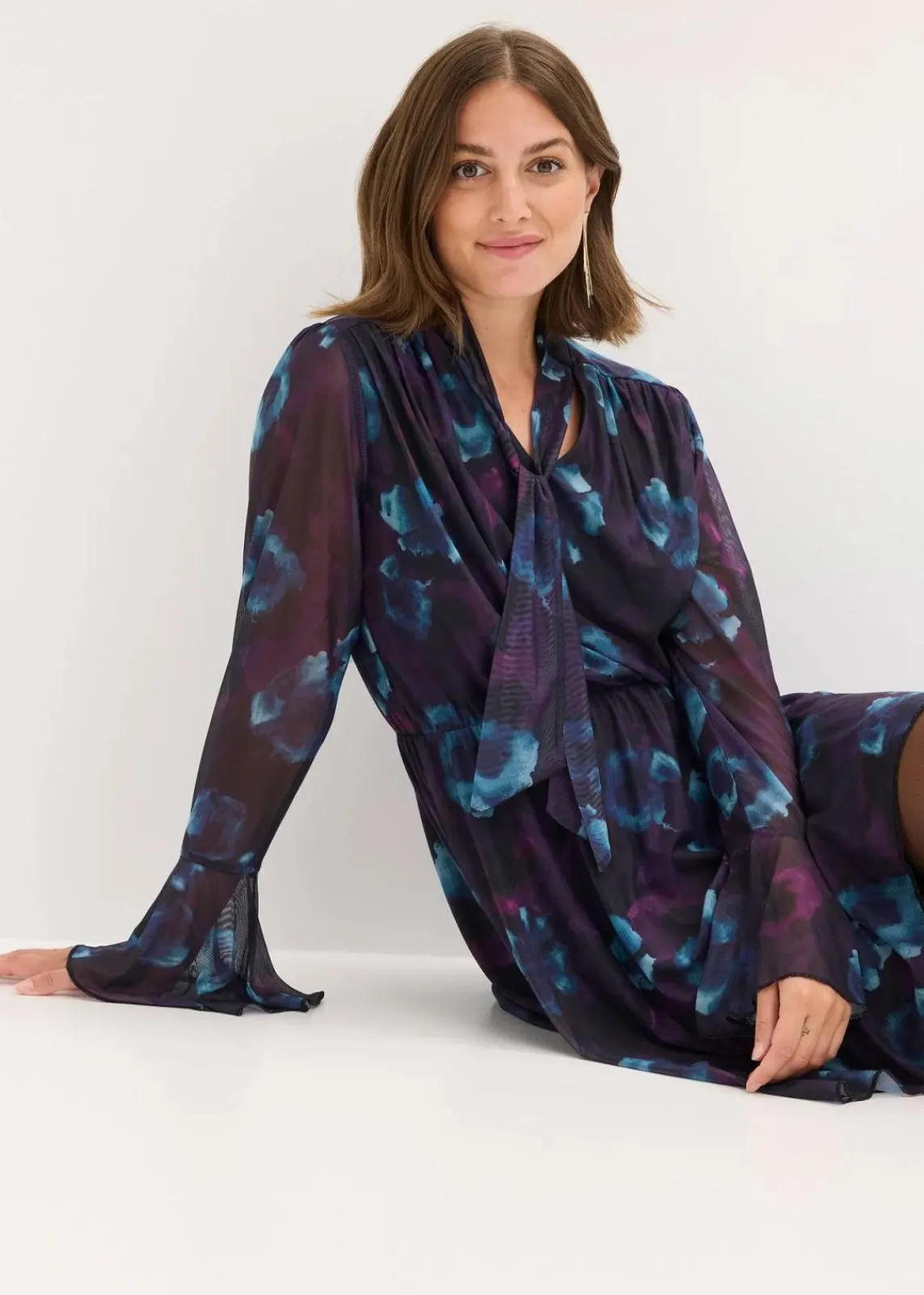 bedrucktes Kleid aus softem Mesh mit Schluppenkragen vorne und Volants am Ärmelsaum