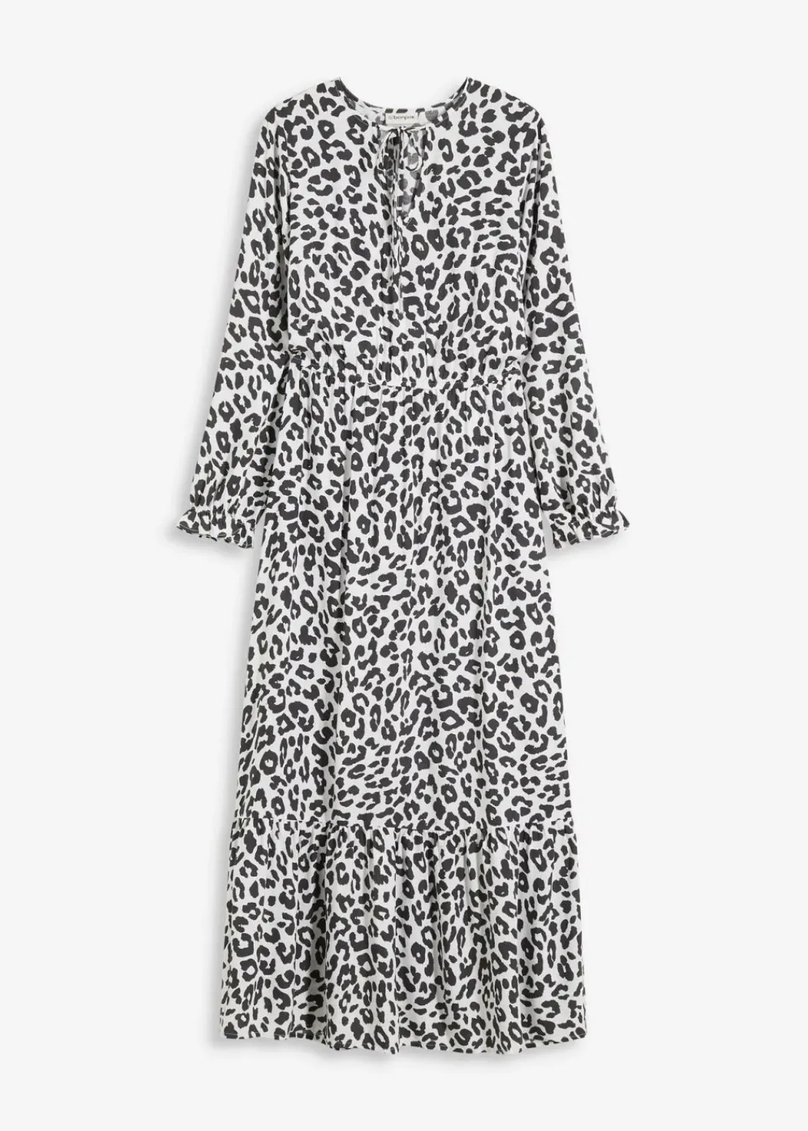 Langes Kleid mit Volants und Bindeband am Ausschnitt