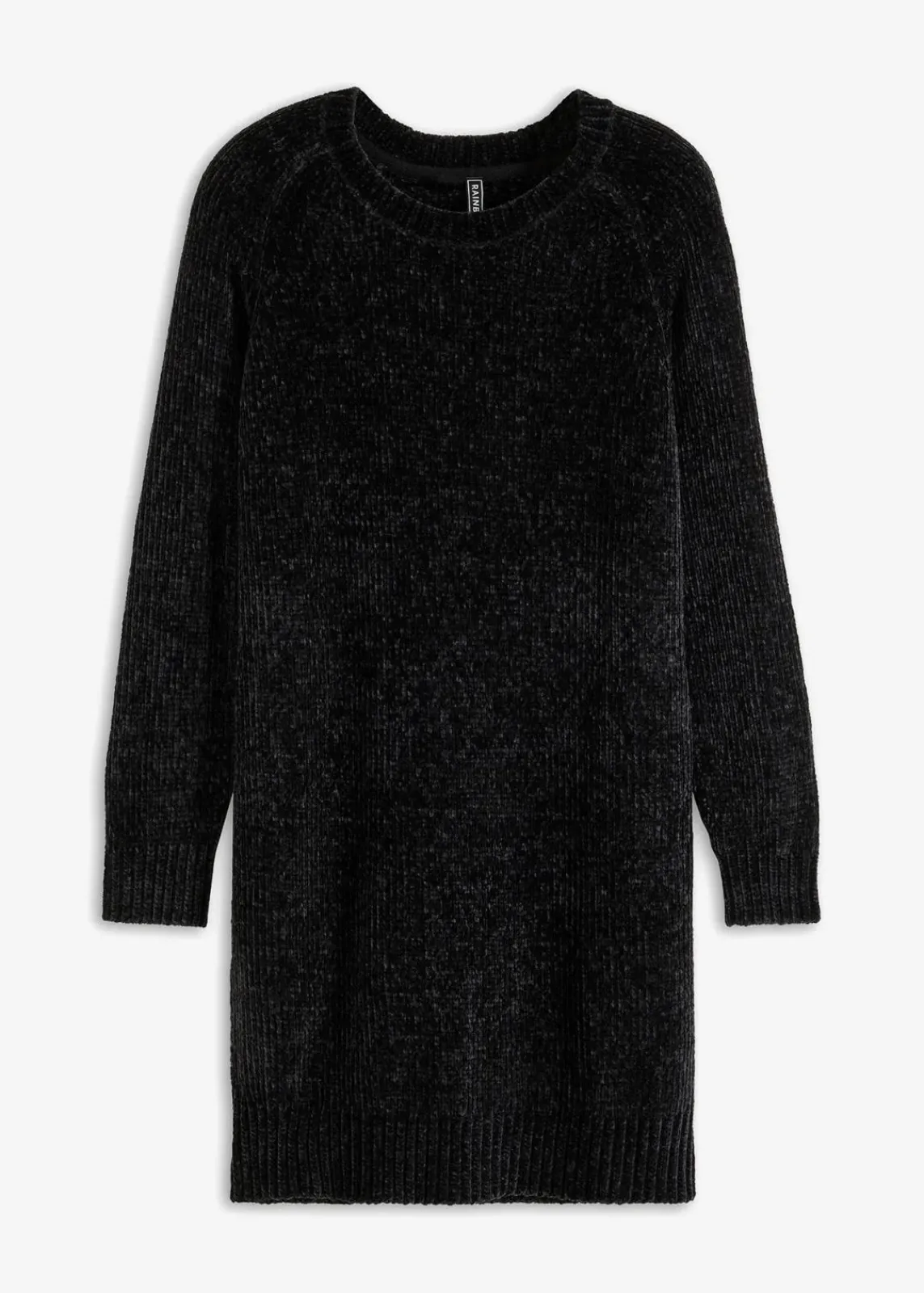 Das Kleid begeistert mit seinem kuscheligen warmen Strick und Bündchen aus Rippe an den Säumen und am Kragen.