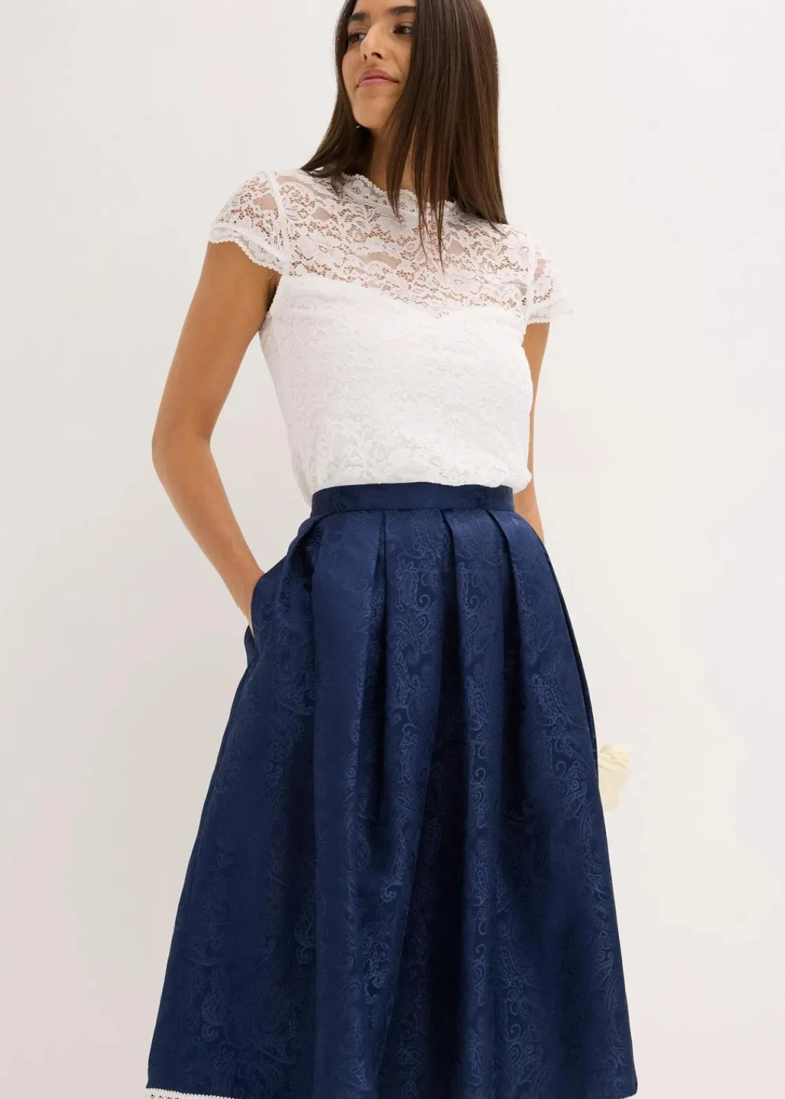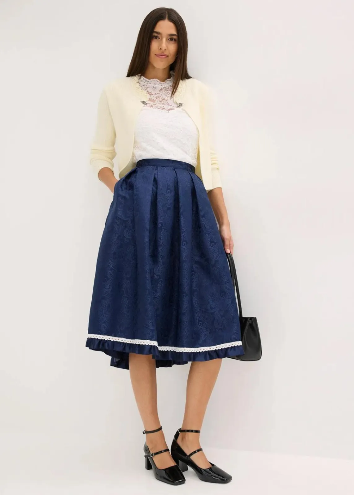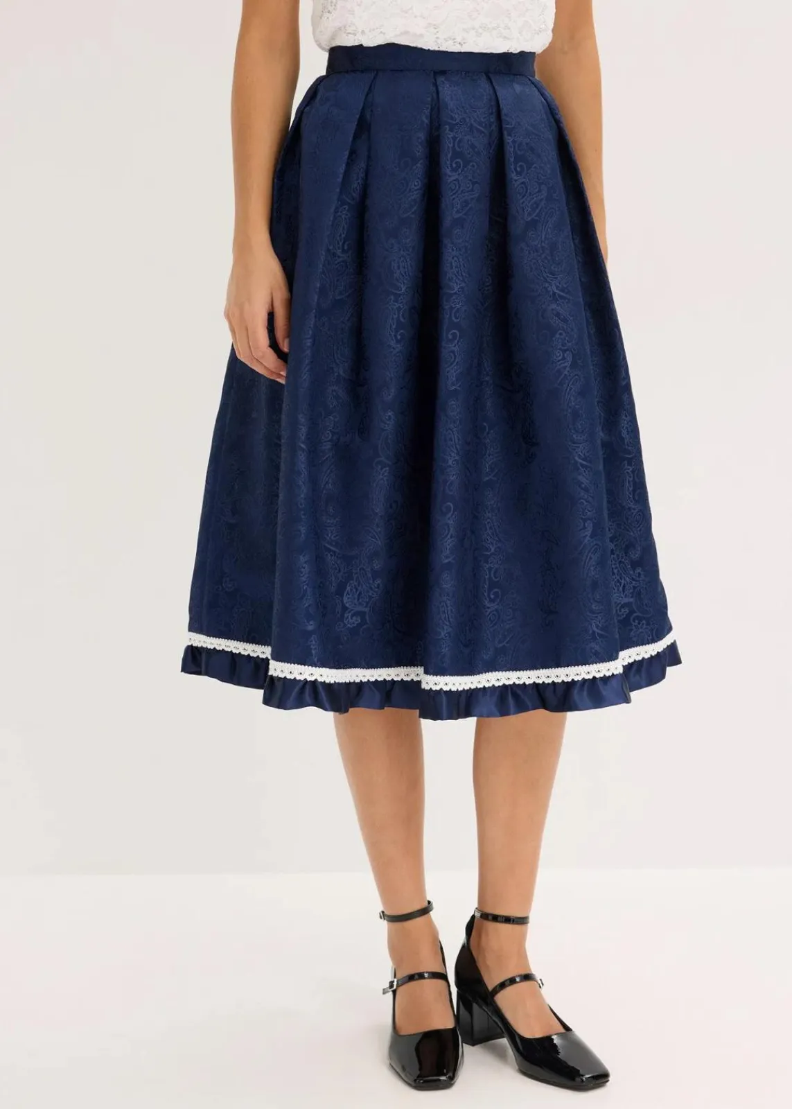 Modern und feminin: Trachten-Rock in Midi-Länge aus glänzendem Jacquard mit Spitzenbordüre