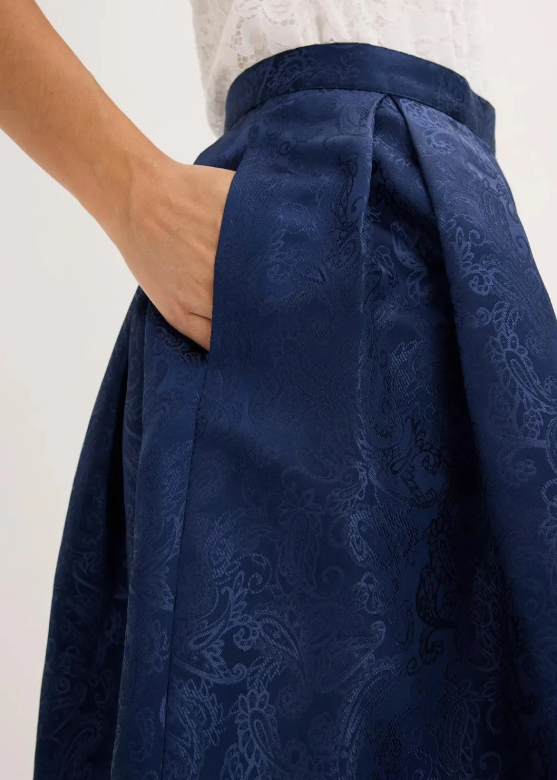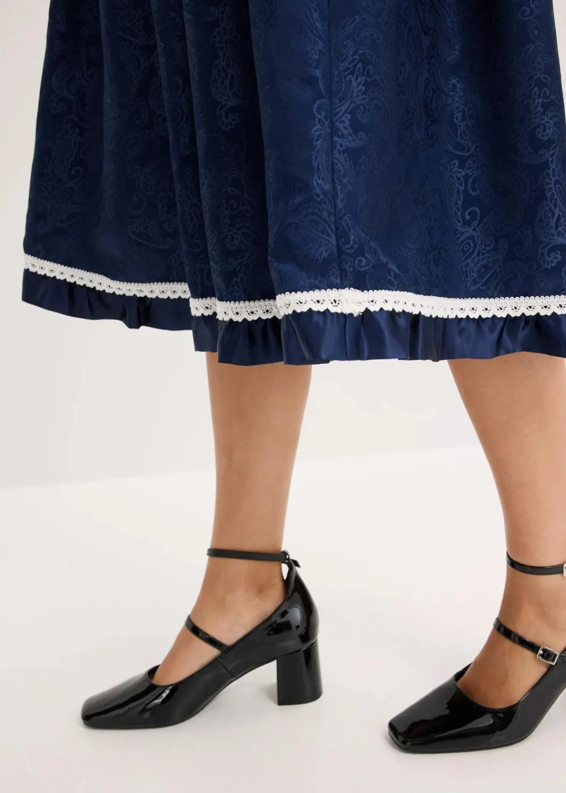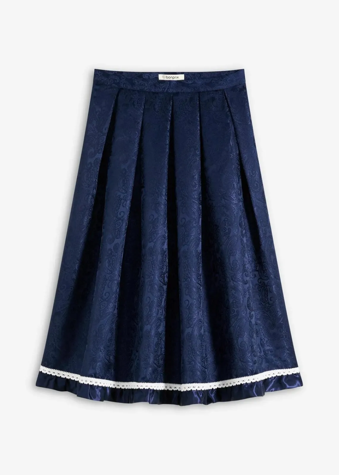 Modern und feminin: Trachten-Rock in Midi-Länge aus glänzendem Jacquard mit Spitzenbordüre