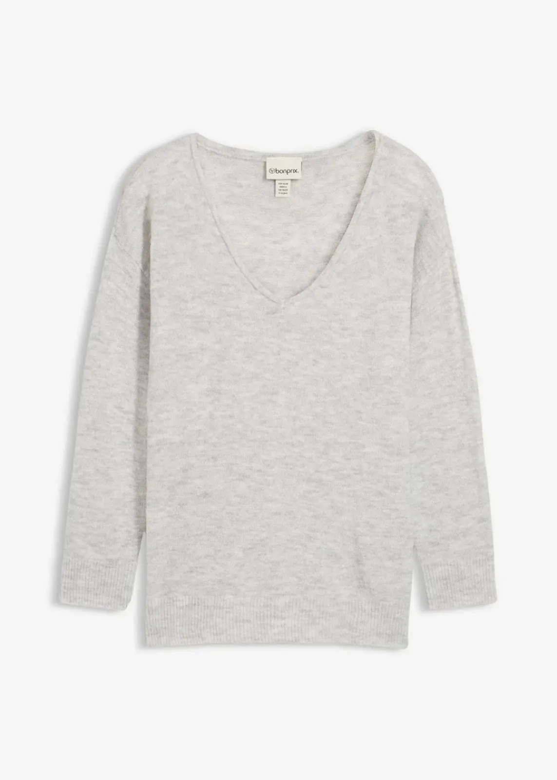 Weit geschnittener Longpullover mit V-Ausschnitt und Seitenschlitzen. Mit Rippbündchen an den Ärmeln und am Abschluss.