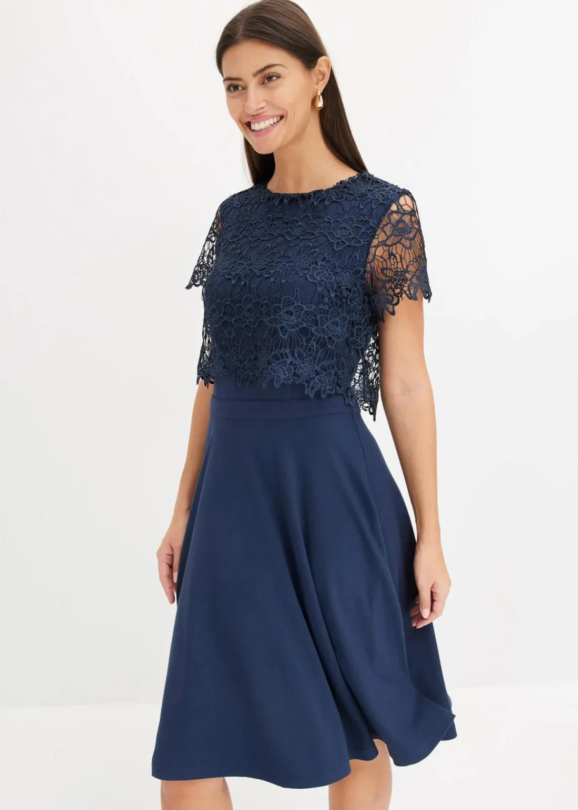 Elegant und feminin: Midi-Kleid mit Spitzen-Oberteil und ausgestelltem Rock