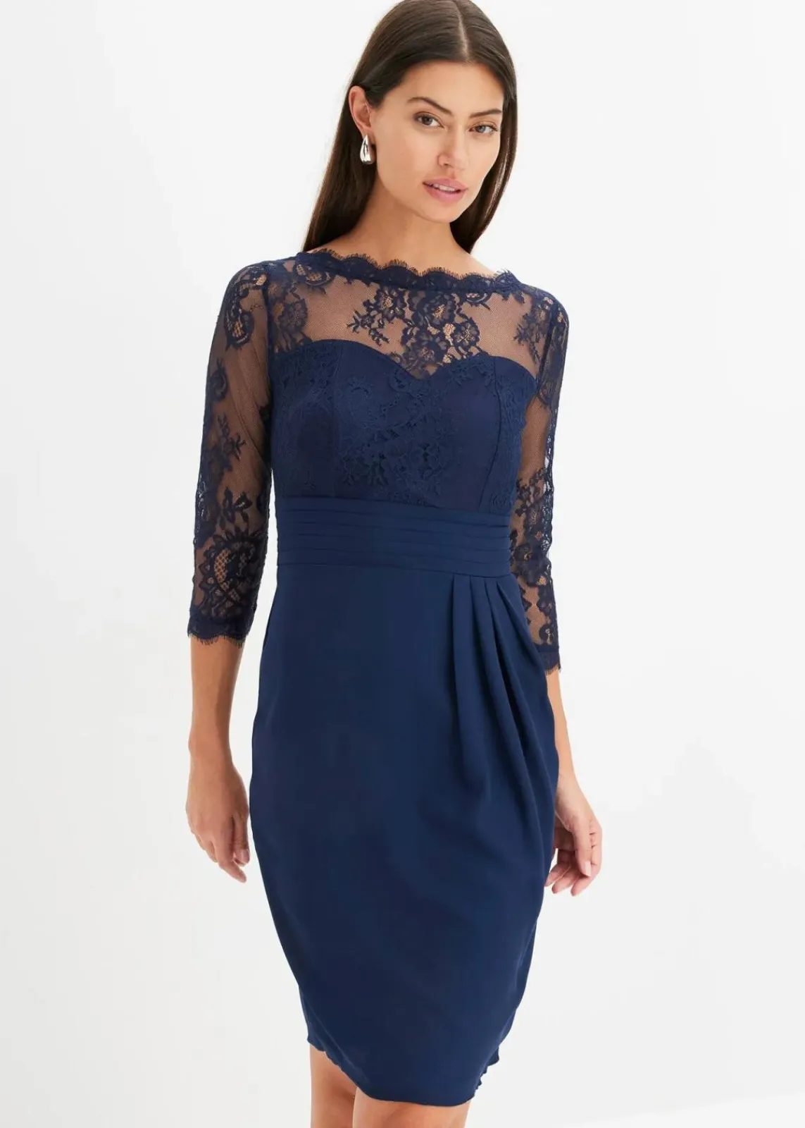 Minikleid mit drapiertem Rock und Spitze im Oberteil mit einer Muschelkante am Ausschnitt und and den Ärmeln