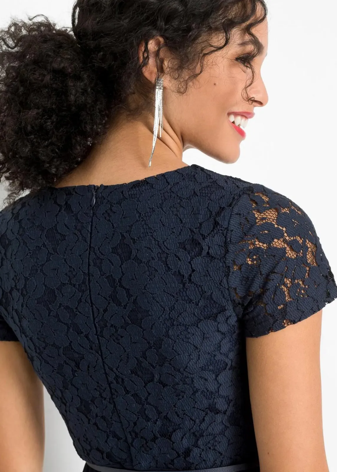 Mit verstecktem Reißverschluss hinten. Oberer Teil aus Spitze. Länge