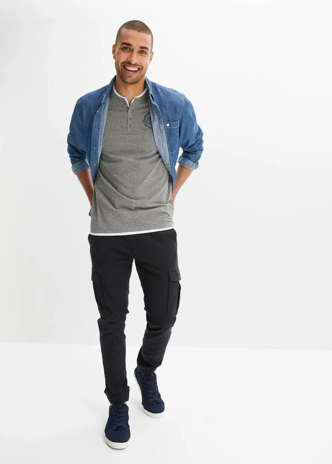 Praktisches 2er-Pack Henley-Shirts im Regular Fit mit kontrastierenden Details, kurzem Arm, coolem Brustprint und stylischen Metallknöpfen