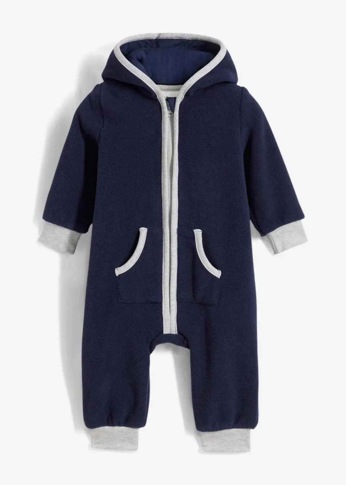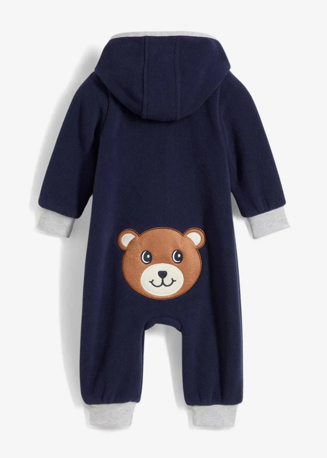 Baby-Overall mit Kapuze aus weichem, hochwertigem Material, das für Komfort und Strapazierfähigkeit entwickelt wurde. Graue Bündchen und Paspeln sorgen für eine sportliche Optik.Mit praktischen Details wie dem durchgehenden Reißverschluss, der das An- und Ausziehen erleichtert. Die niedliche Bärchen-Applikation am Po setzt einen liebevollen Akzent, der beim Krabbeln gut sichtbar ist.Ein robustes und bequemes Kleidungsstück, das keine Kompromisse beim Tragekomfort eingeht.