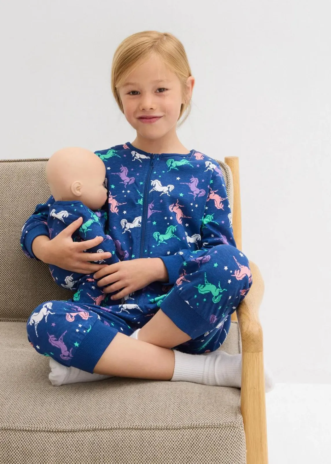 Mit diesem wunderschönen Set können sich trendige Girls mit ihren Puppen im Partnerlook kleiden. Der Allover Print mit Einhorn-Motiv ist ein besonderes Highlight im Kleiderschrank. Auf der Vorderseite des Overalls befindet sich ein Reißverschluss mit Kinnschutz zum bequemen hinein schlüpfen. Die weiche Baumwoll-Qualität sorgt für einen optimal kuscheligen Tragekomfort.