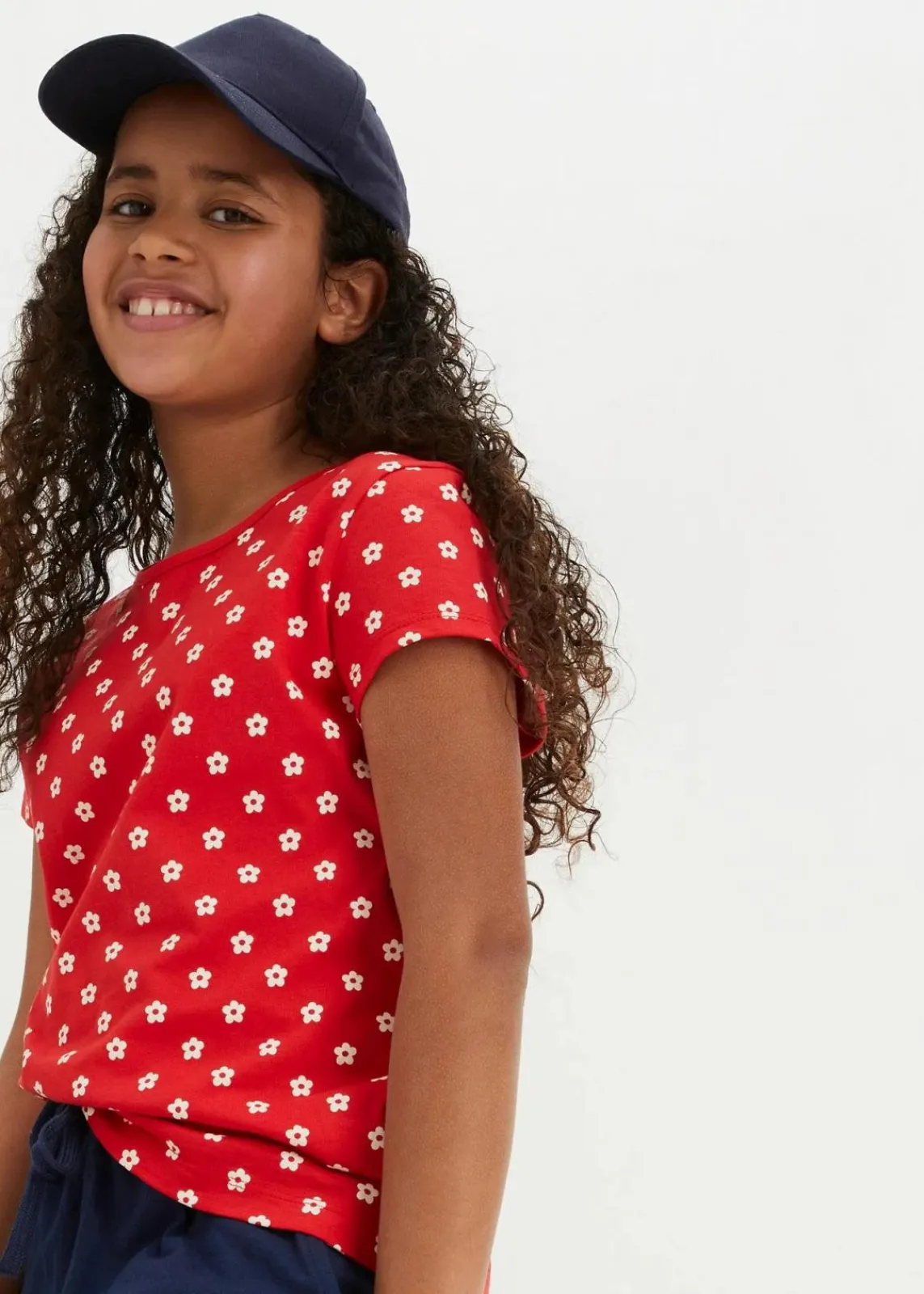 2er-Pack Sommerliche T-Shirts für Mädchen: Rundhalsausschnitt, kurze Ärmel, Print-Mix – weiße Variante mit Motivdruck, rote mit Allover-Muster!