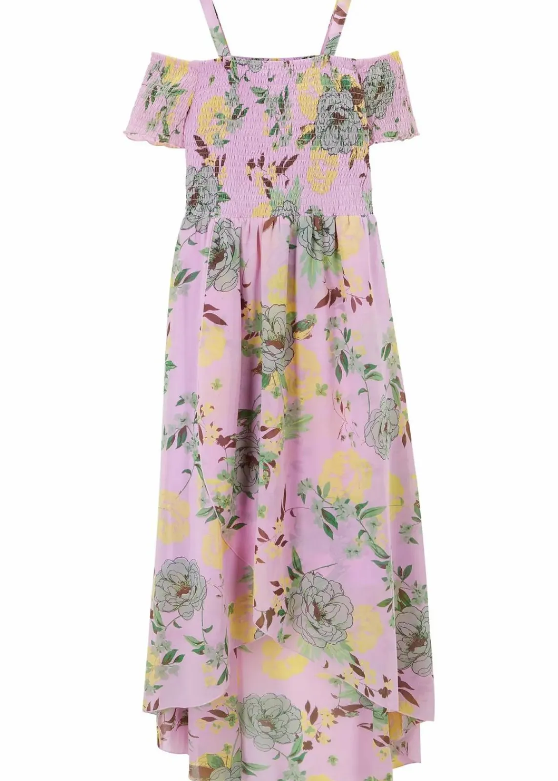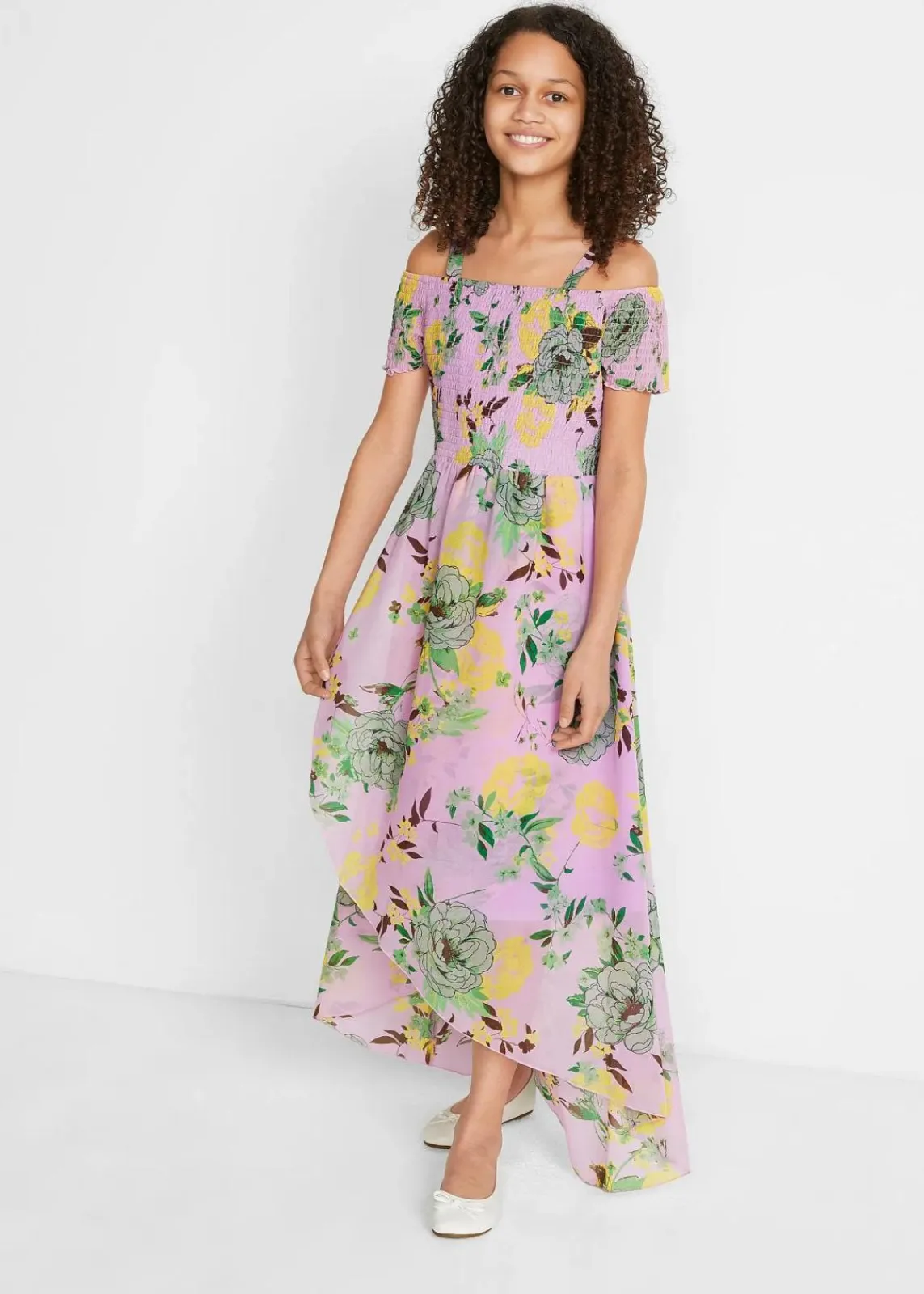 Dieses schöne Kleid überzeugt durch sein geblümtes Design, den schultefreien Ausschnitt und das lange Rockteil. Dieses Kleid mit gesmoktem Oberteil ist ein absolutes Highlight für alle trendigen Girls!