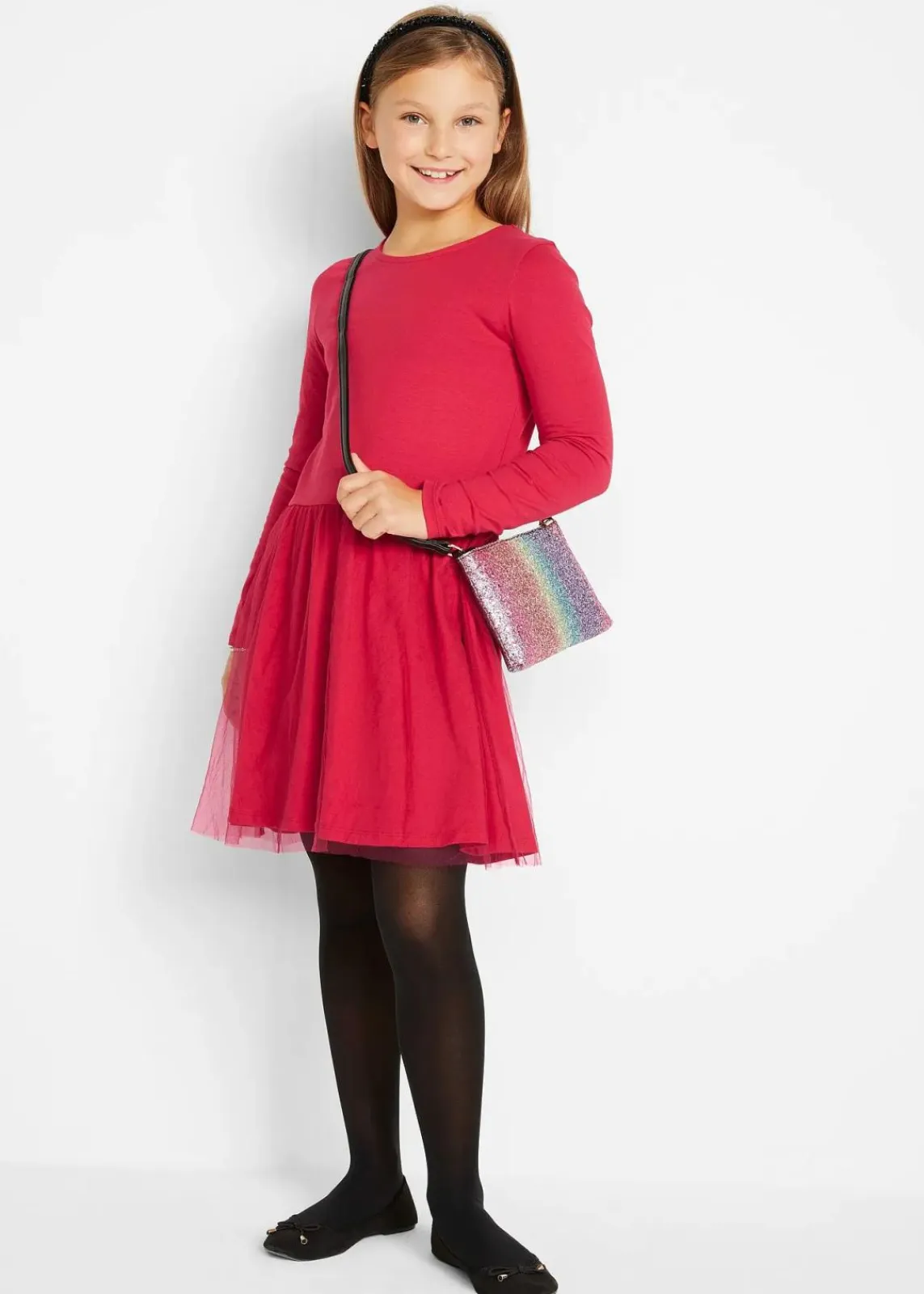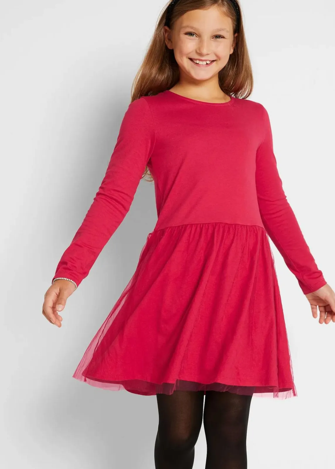 Ein festliches Kleid für Mädchen mit verspieltem Tüllrock. Die langen Ärmel sind perfekt für die kalte Jahreszeit.