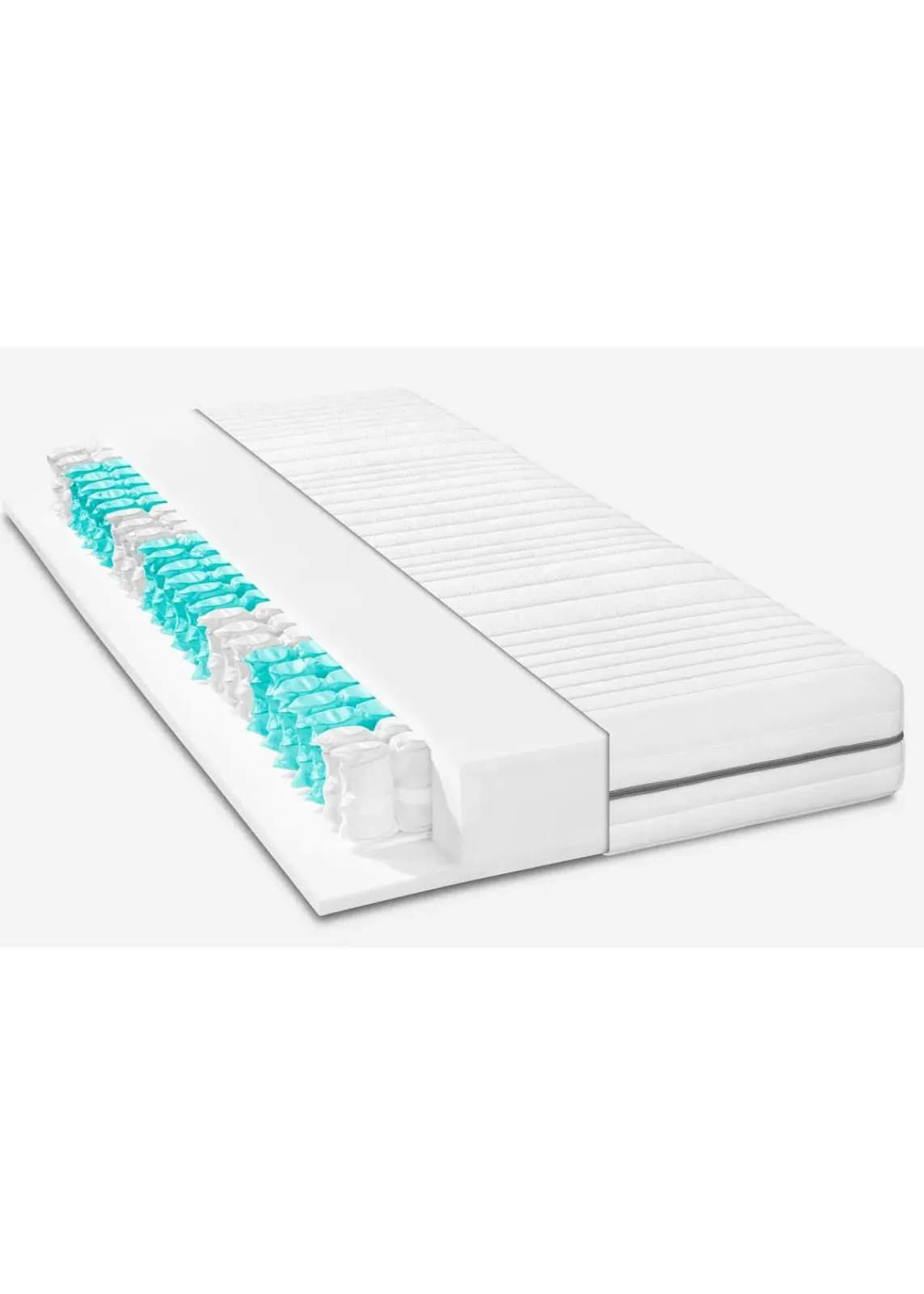 Dies ist eine 7-Zonen Taschenfederkernmatratze mit einer beiseitigen Komfortauflage, die für besondere Weichheit der Oberfläche und guten Schlafkomfort sorgt. Der Taschenfederkern bietet ein sehr gutes Ventilationssystem und unterstützt ein gesundes, trockenes Schlafklima. Der verwendete Taschenfederkern ist ein sogenannter 400er Tonnentaschenfederkern.