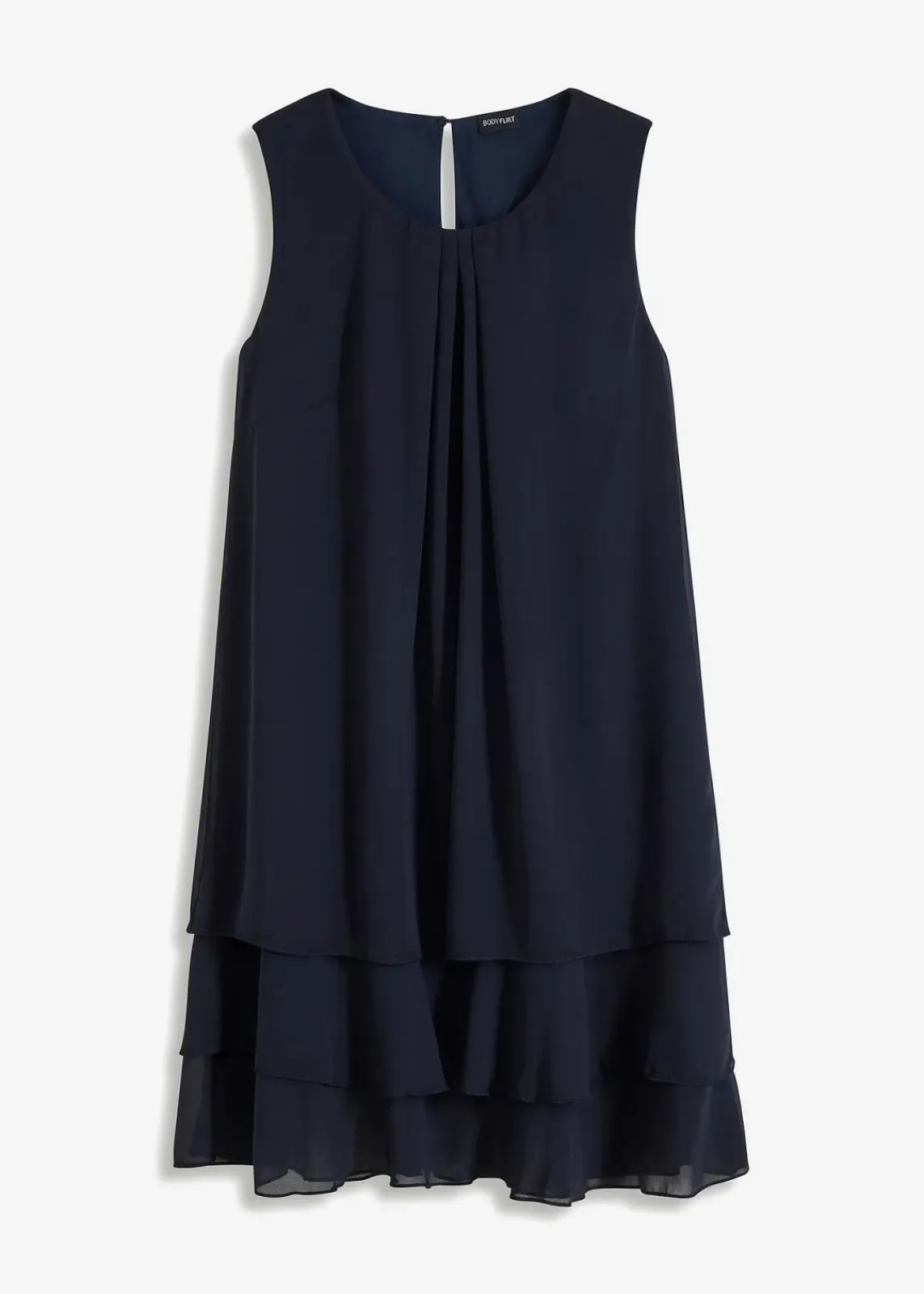 Feine Finessen setzen die klare Silhouette dieses Modells raffiniert in Szene. Dazu gehören die kleinen Falten am Rundhalsausschnitt, die von dort aus im locker fallenden Stoff verlaufen. Ein mehrlagiger Volant am Saum verleiht dem Chiffonkleid einen romantischen Touch. Die A-Linie umspielt sanft den Körper.Mit Glitzersteinen verzierte Ohrringe und Armbänder sowie dezente Pumps gehen mit diesem ärmellosen Chiffonkleid von BODYFLIRT eine hinreißende Verbindung ein.