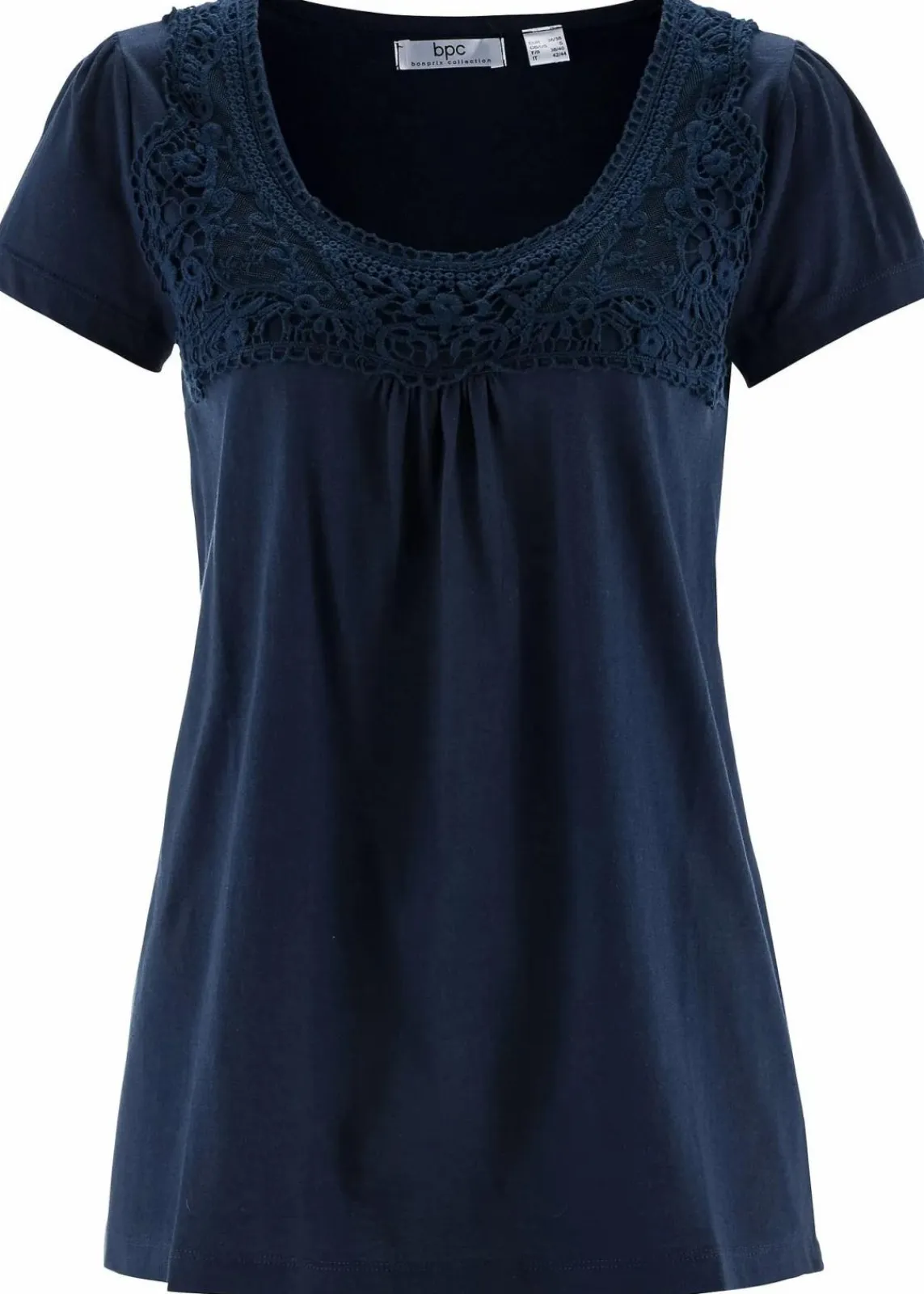 Die wunderschöne Spitzenapplikation verleiht diesem Shirt mit Kurzarm aus der bpc Kollektion eine verspielte Note. Die leichte Raffung unterhalb der Brustnaht sorgt bei diesem Shirt für eine attraktive Optik.Der tiefe Rundhals-Ausschnitt lässt Platz für passenden Schmuck. Zusätzlich umspielt die leicht ausgestellte Form vorteilhaft die Figur.