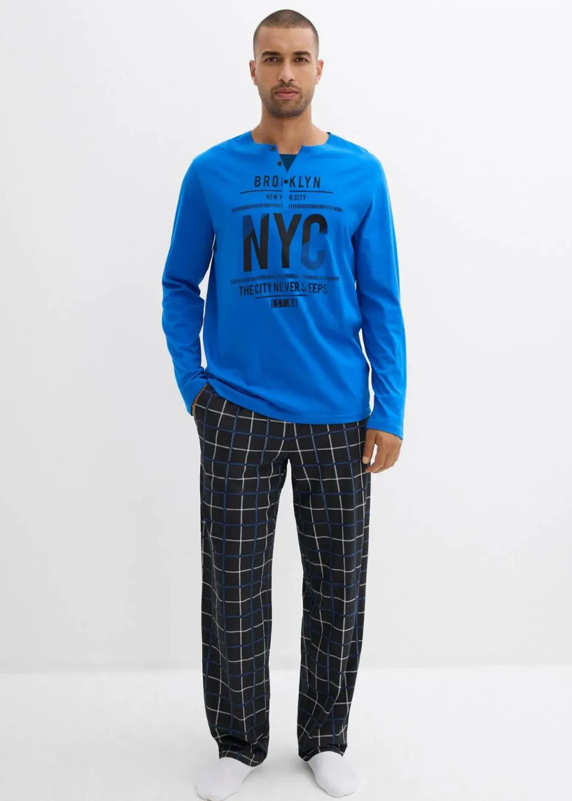Gemütlicher Herren Pyjama mit Knopfleiste am Ausschnitt und einem Hosenbündchen mit Bindeband.